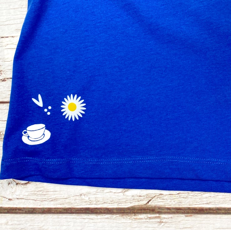 The design is from my own daisy picnic drawing which we screenprint onto a lovely bright Royal Blue top with white ink. The yellow centres are a added in soft yellow flock.
