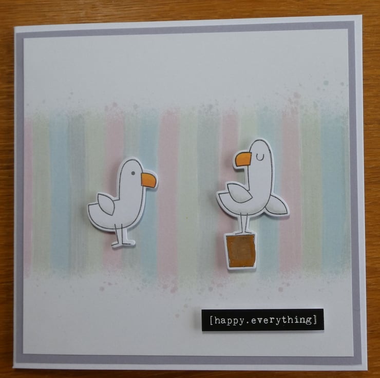 It features a pair of die cut gulls which have been hand stamped and inked and slightly raised above a printed band of stripes of pastel colours and splatters,.