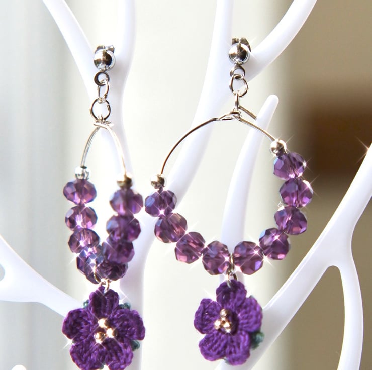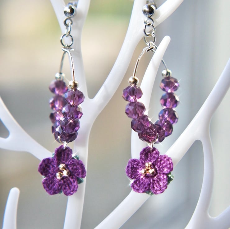 Microcrochet Purple Flowers Stud Drop Earrings