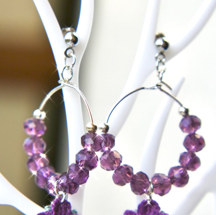 Earrings made with 6mm purple crystal glass beads and Embroidery Threads.