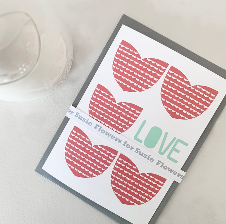 The cute little hearts are designed using my signature soft scallop repeat pattern in vintage red. The simple message of 'Love' sits in a soft contrasting mint green.