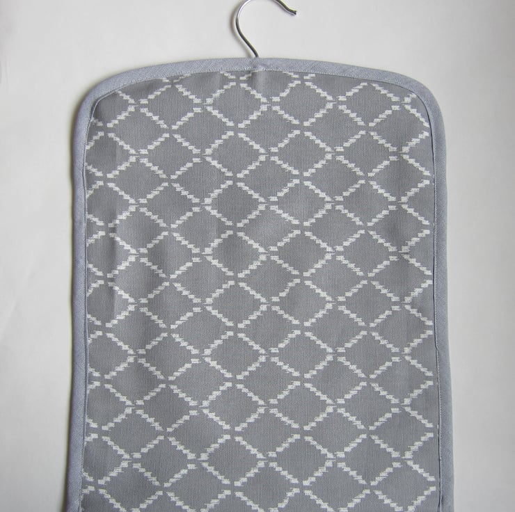 It is fully lined with a dark grey fabric and edged with a blue / grey bias binding.