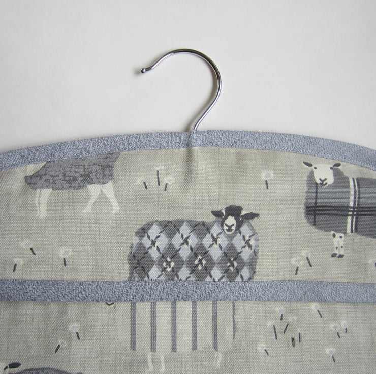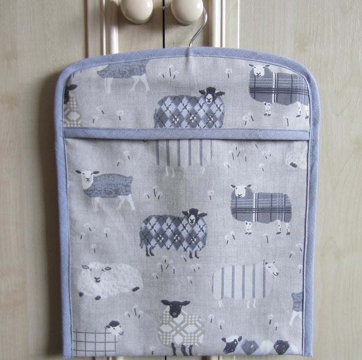 This sturdy peg bag is made with fabric featuring sheep on the front and a coordinating grey patterned fabric on the back.