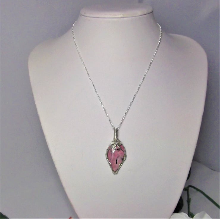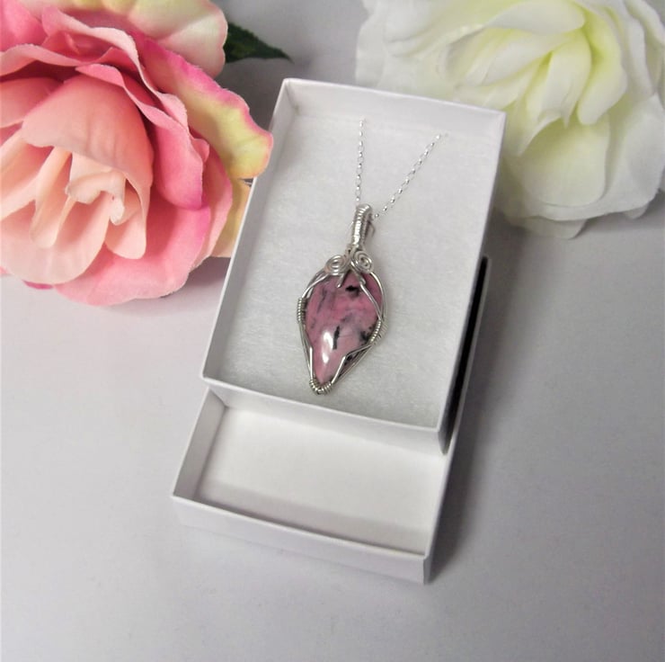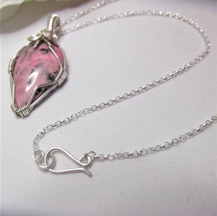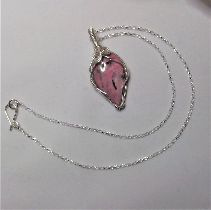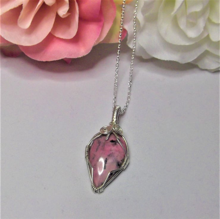 This pendant has been made using a Rhodonite cabochon and sterling silver wire.