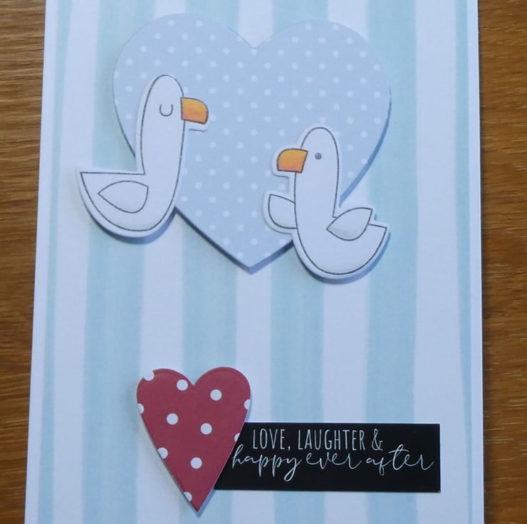 This card has a pale blue & white striped paper background. A pale blue and white polka dot card heart and two hand stamped and inked gulls have been die cut and attached towards the top of the card, raised from the background on foam pads.