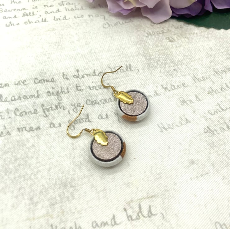 Gold plated leaf shaped bails were secured to the rear and I’ve added gold plated stainless steel earring hooks with scroll detail. Stainless steel is hypoallergenic and great for those with sensitive skin.