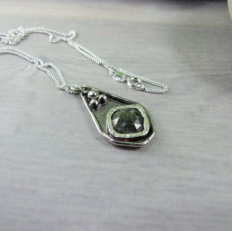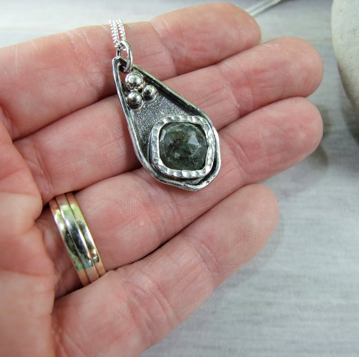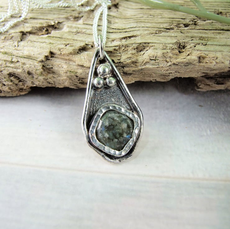 I have created the pendant from recycled silver sheet for the base, hand drawn and cut into a teardrop shape. To this I have added a bezel wich fits the stone perfectly and then added some decorative silved beads to the pendant. The labradorite gemstone has been faceted but there are a few places where the stone has imperfections, though it does not affect the look of the overall pendant. Fitted to sterling silver 18 inch chain.