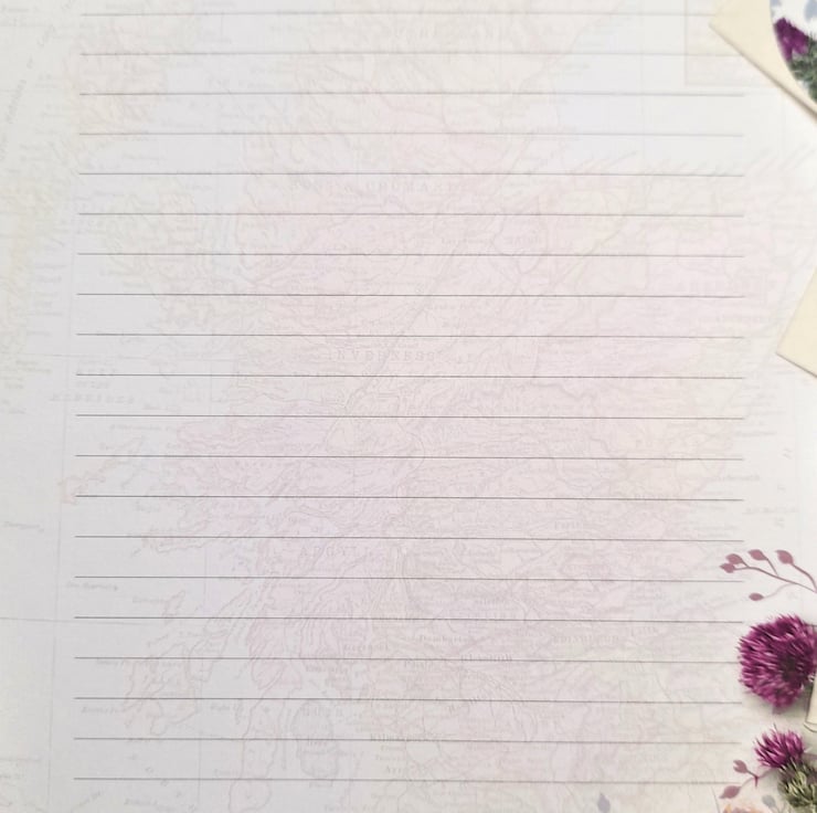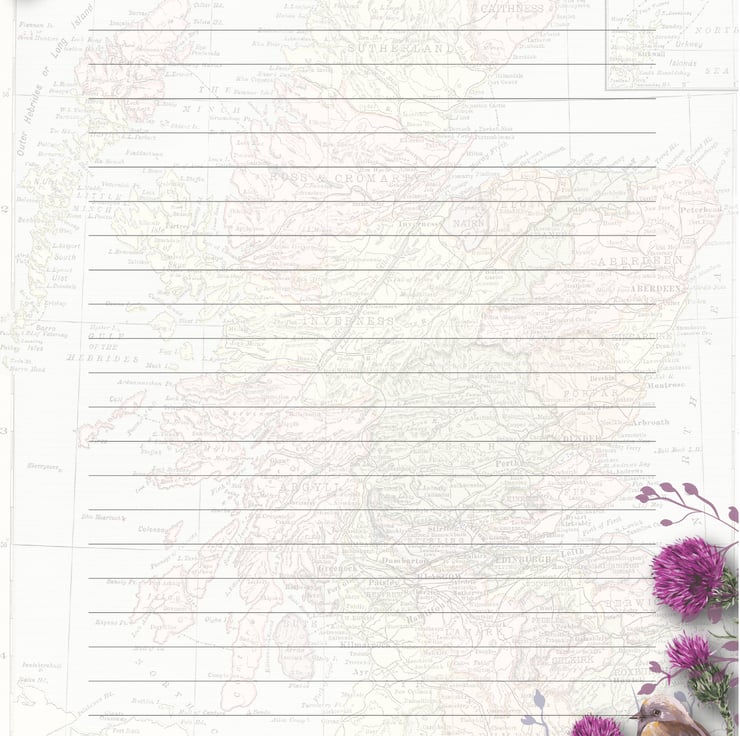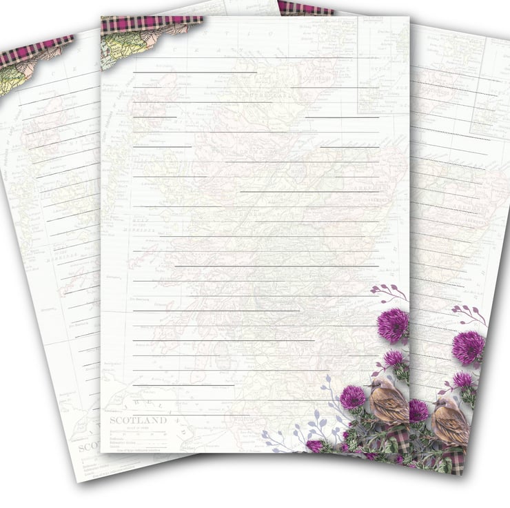 A set of 10 sheets of A5 size handmade letter writing / notepaper set with a pretty tartan and thistle corner detail over an old map of Scotland in thebackgound.
