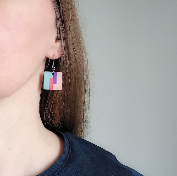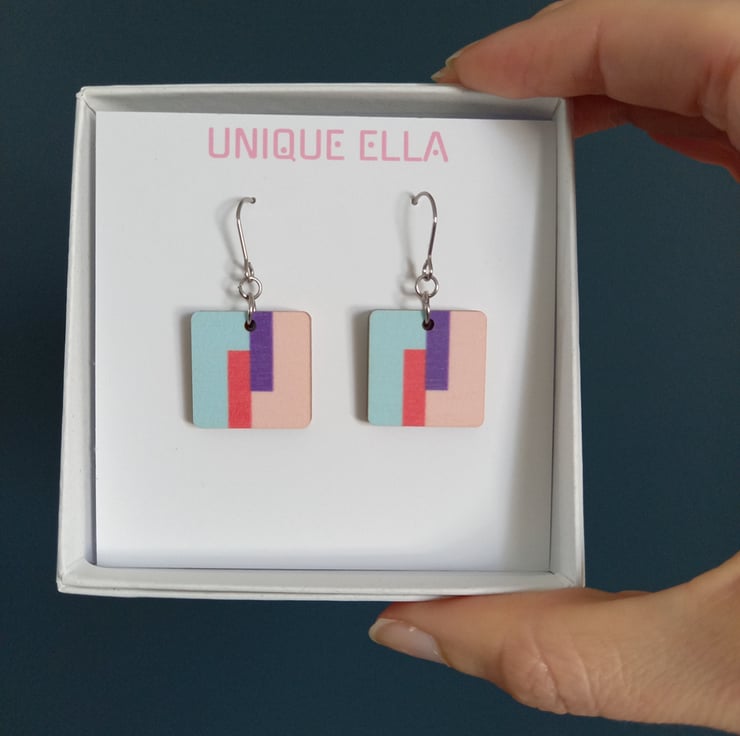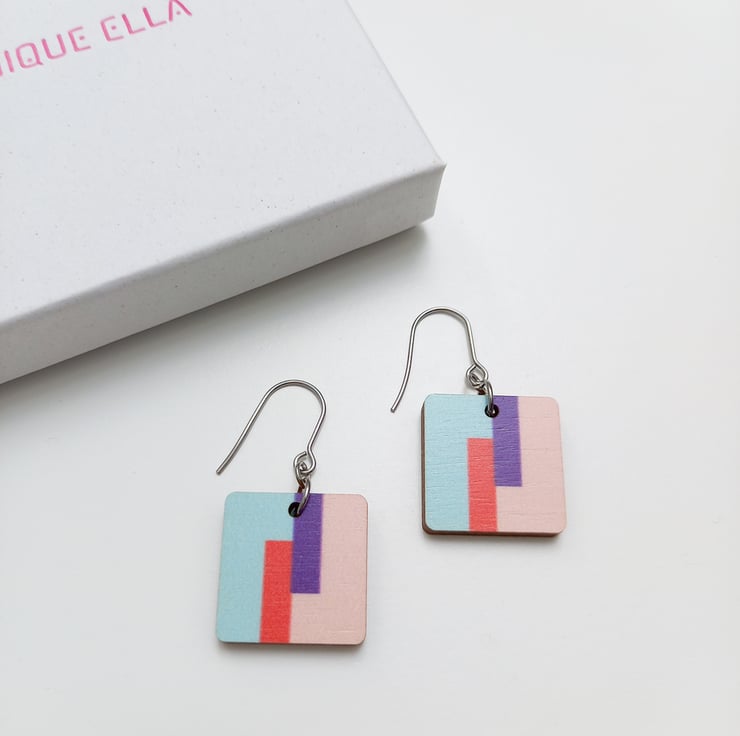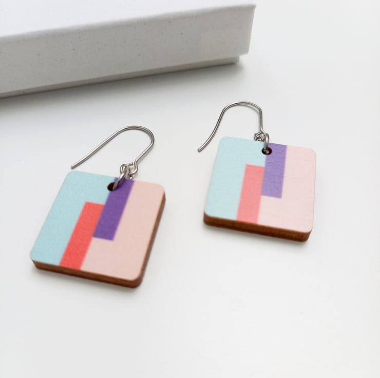 These square wooden drop earrings have a colourful print inspired by modern abstract art. The pattern is printed with ecological printing ink and sealed with varnish.