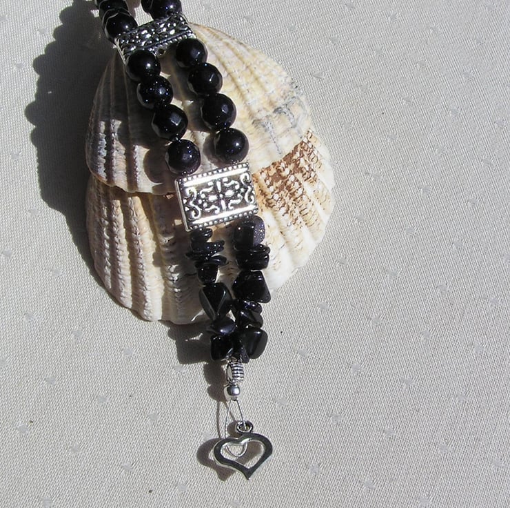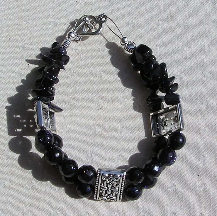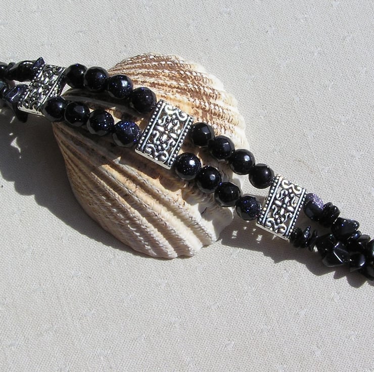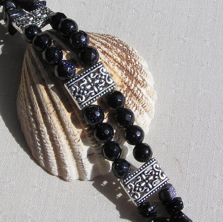This Stunning Bracelet is made wholly from Blue Goldstone – Faceted round Beads & Gem Chips… each section separated by an ornately decorated Tibetan Silver Bar Spacer with a tiny Silver Heart at each end - a Beautiful combination that will look stunning either worn casually or with something more Elegant for a Special Evening out