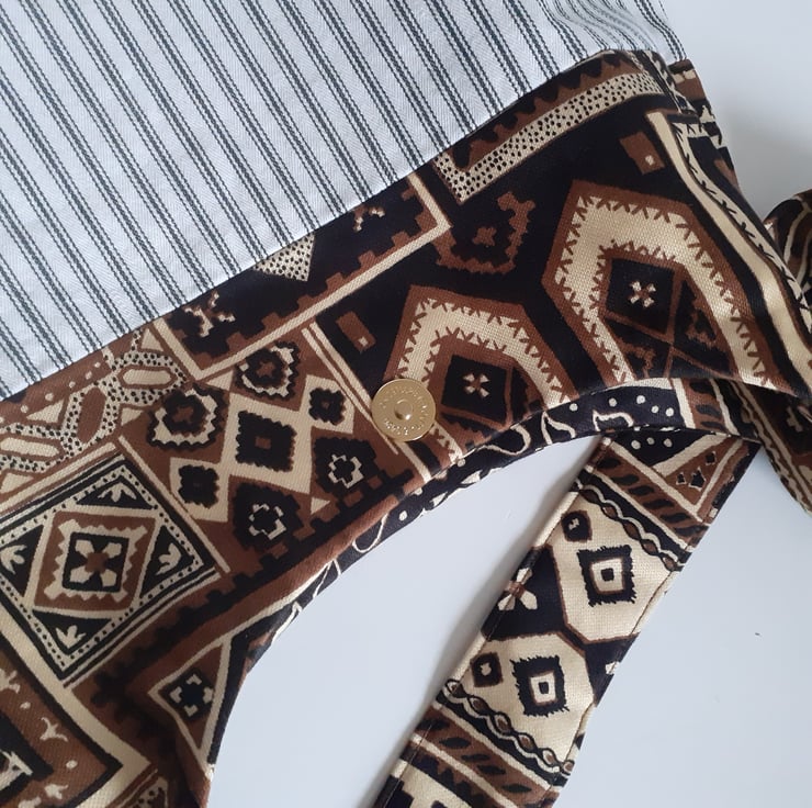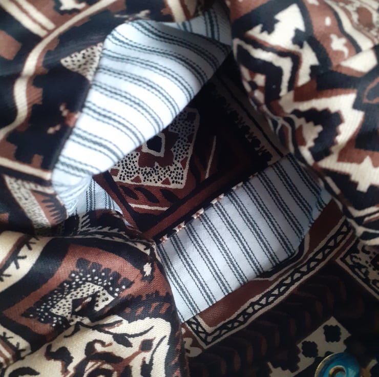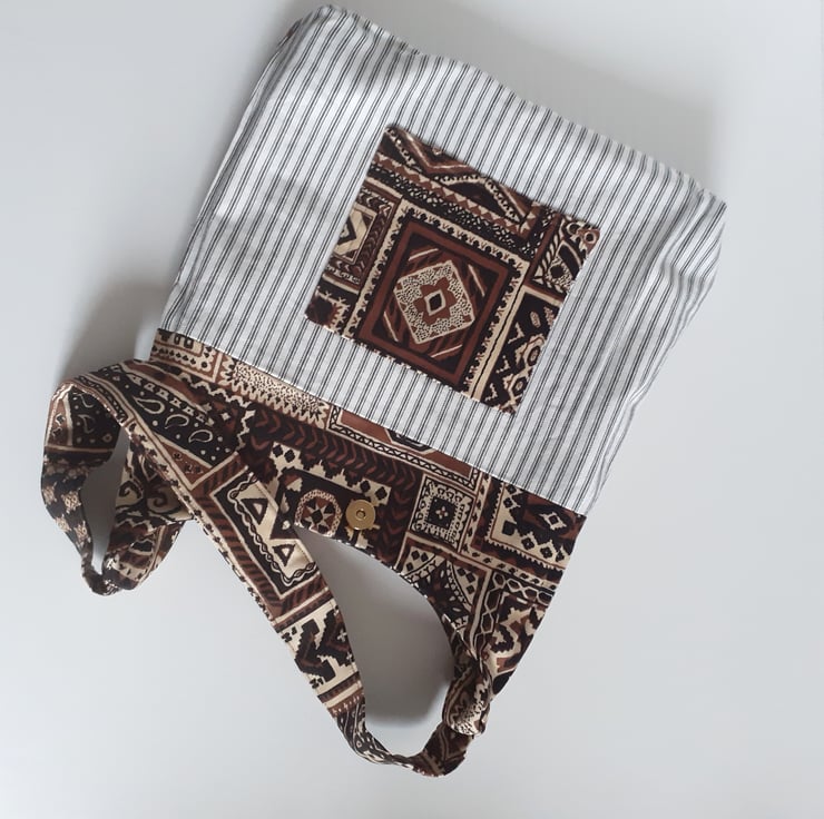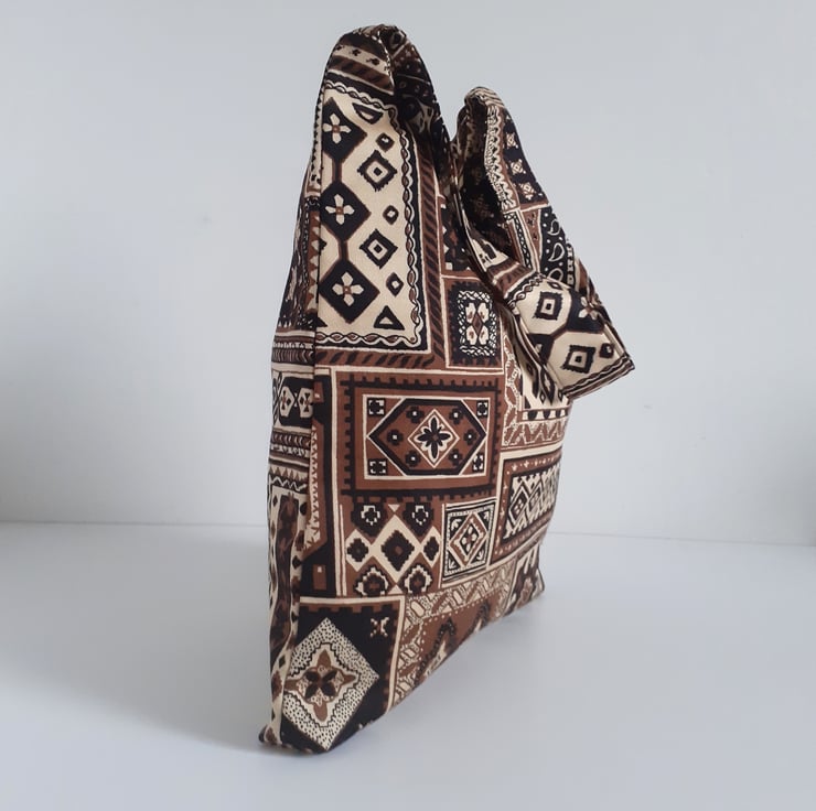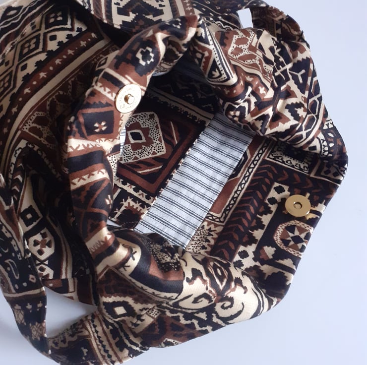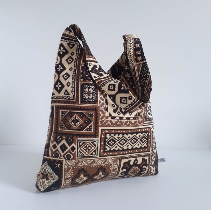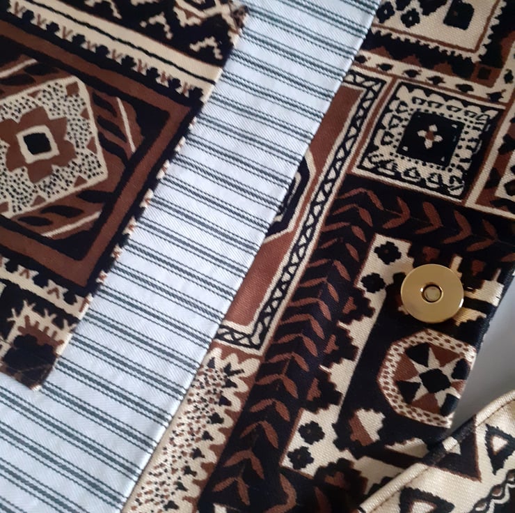 A shoulder bag for shopping, the beach or for uni. It is made in a bold vintage 70s fabric called Ottoman featuring a print of patchworked printed squares in browns and black with a middle eastern feel. This practical, soft bag has a short wide strap making it tuck neatly under your arm. It has an internal pocket, and is lined in old skool black and white ticking, and closes with a magnetic clasp. There are no flaws in this bag, it is in my Seconds Sunday sale as an end of line piece, to make some space for new stock.