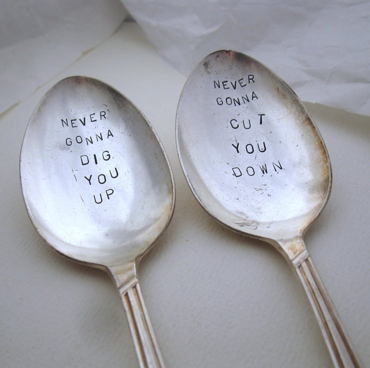 A pair of garden plant labels made from hand stamped vintage dessertspoons with a humorous take on a very famous song and a possibly even more famous internet meme. Perfect gift for a keen gardener, ideal for plant pots on a windowsill. Or why not give potted plants or a windowbox as a gift, complete with these labels?