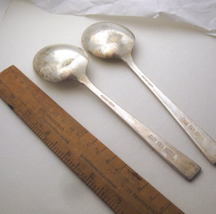 You will receive the exact set shown in the photos. The spoons are matching with floral handles, approximately 18.5cm tall and somewhat old and battered. The lettering is coloured black with acrylic paint and hence may not be colourfast in outdoor use although it's very easy to add more paint to the letters if it does eventually wash off. The lettering itself is stamped into the metal so it's not going anywhere. Not recommended for food use, although the paint is non-toxic.