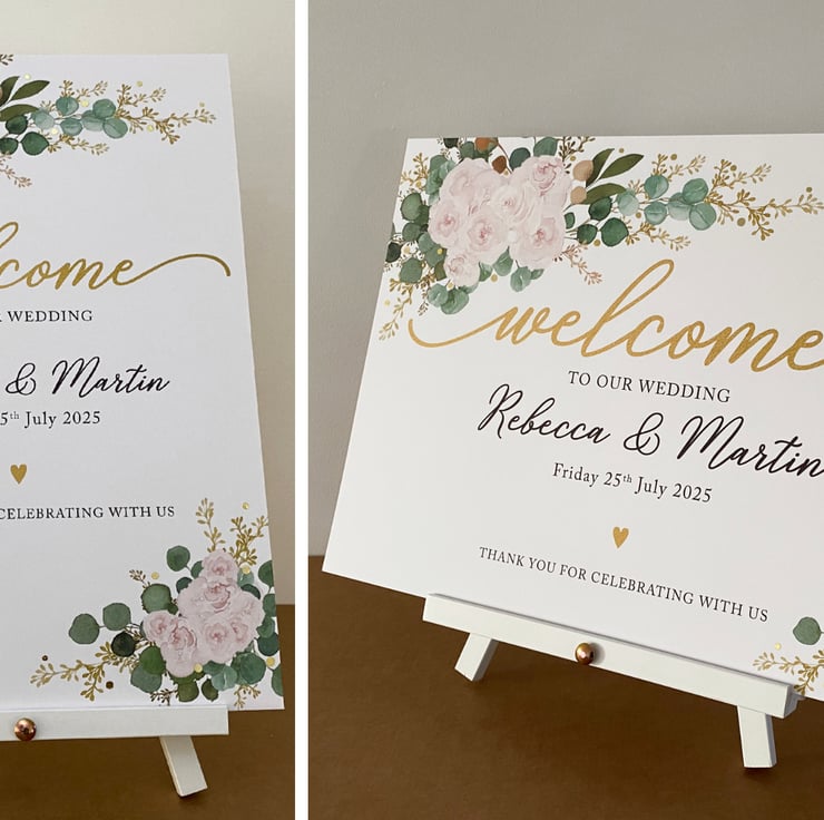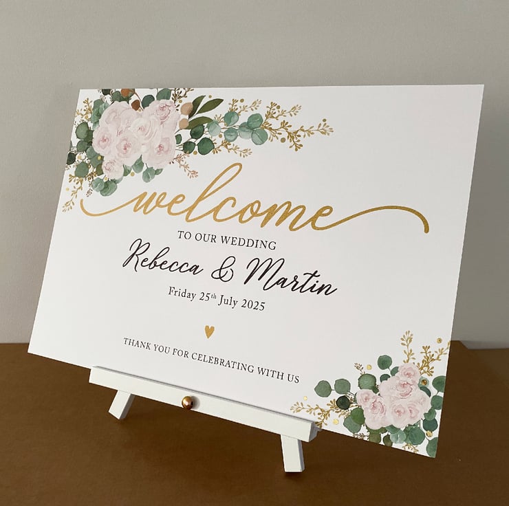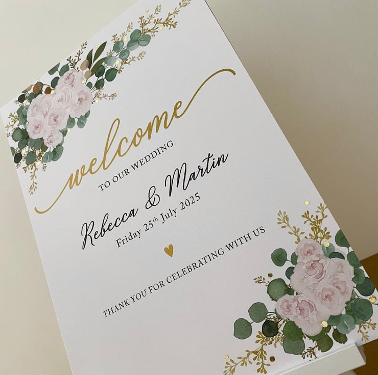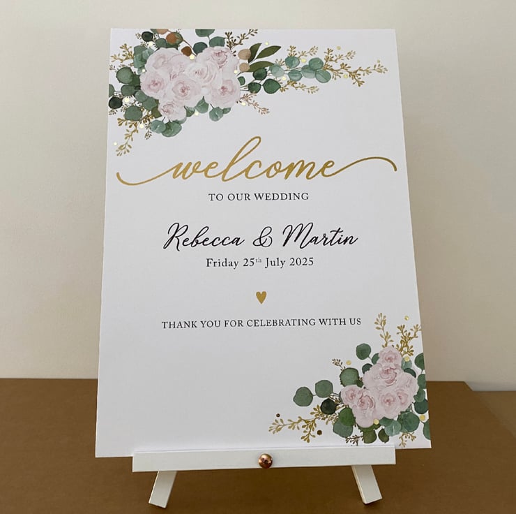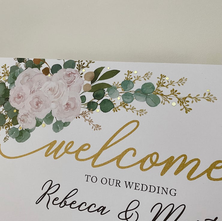 Personalised WELCOME to the WEDDING sign in A3, A2 and A1 size, blush pink roses and eucalyptus leaves greenery, golden leaves, rustic wedding theme design with added metallic gold polka dots.