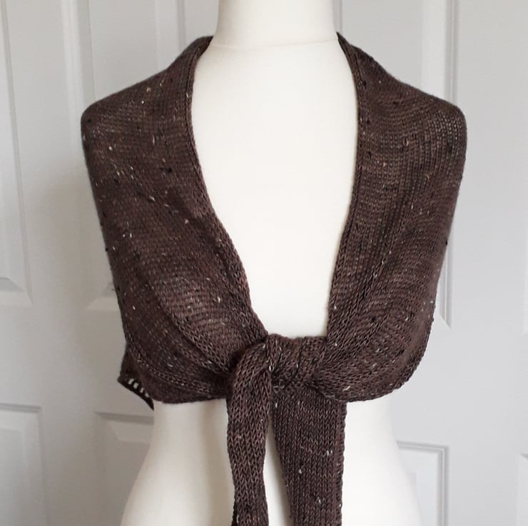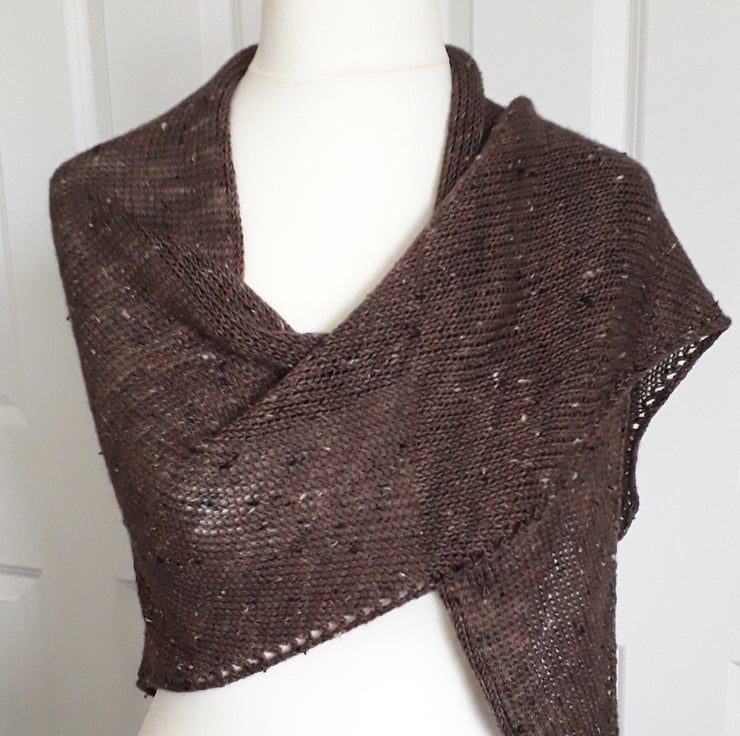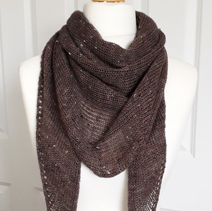 Made from hand dyed merino wool, this triangular shawl is beautifully soft and light, but also very warm and cosy. It has been lovingly knitted on a hand operated knitting machine using beautifully soft Merino wool with Donegal Nep, and features eyelets along two sides for a decorative finish.