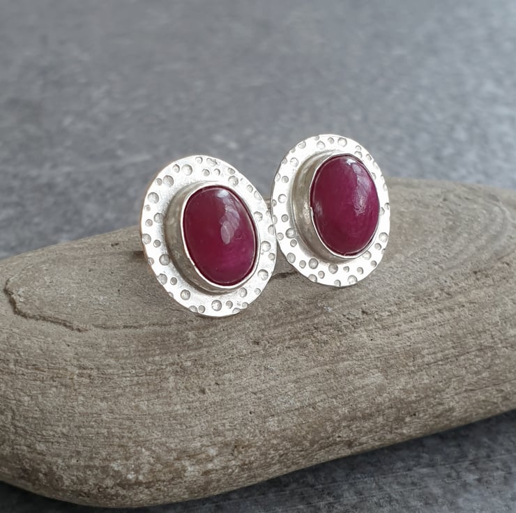 These stylish earrings feature genuine ruby cabochons which I've set in sterling silver with a dotty pattern surrounding the stones. The rubies are a lovely shade of pinkish red which really pops against the silver.