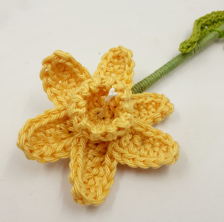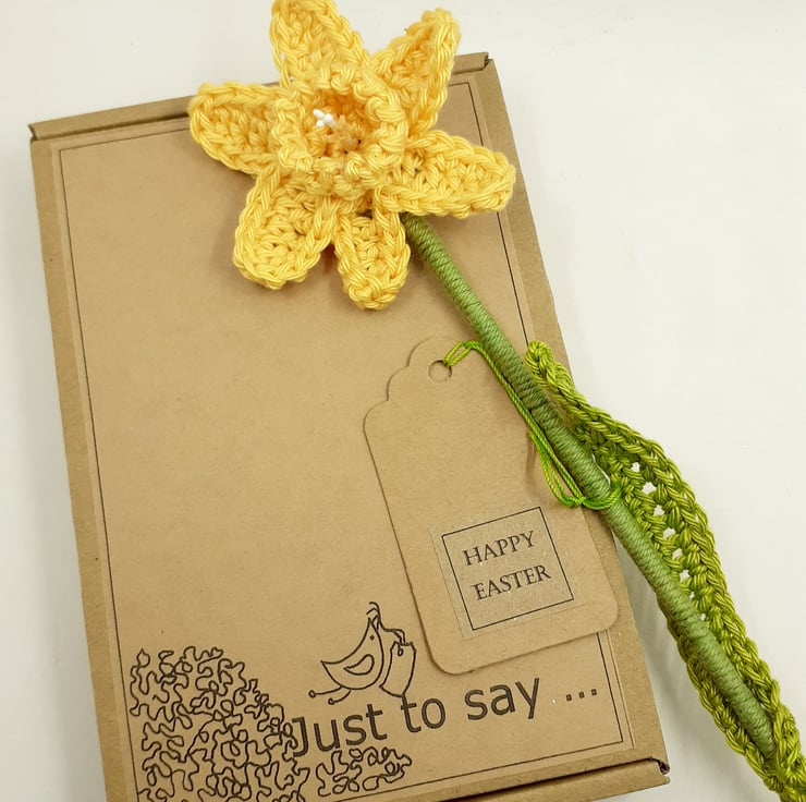 This cheery daffodil is crocheted in cotton and is adapted from a lovely pattern by Lucy at Attic24. It has a pistil made from paper stamens wrapped with floristry tape. The stem is a bamboo stick wrapped in cotton. The tag reads Happy Easter, although I am very happy to exchange this tag for one with wording of your choice.