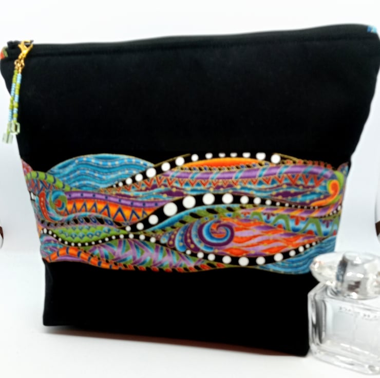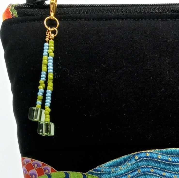 19x22x7 cm in size and wadded it has a black cotton lining and a cute beaded zip pull.