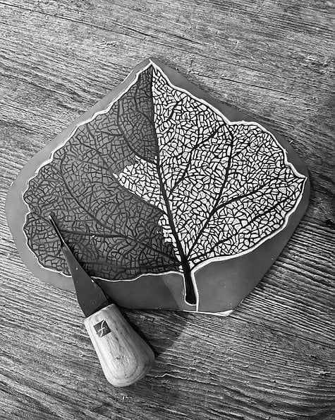 This is an original, hand illustrated and carved Linocut Print depicting a leaf skeleton.