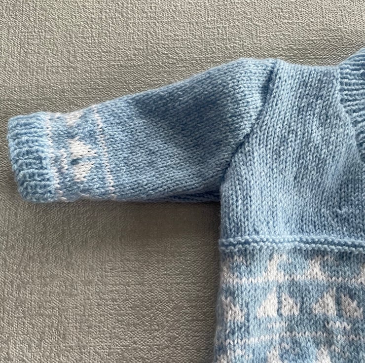The pattern size used is for a 0-6mth old baby and it measures 48cm round the chest, 21cm in length and the underarm sleeve length is 13cm