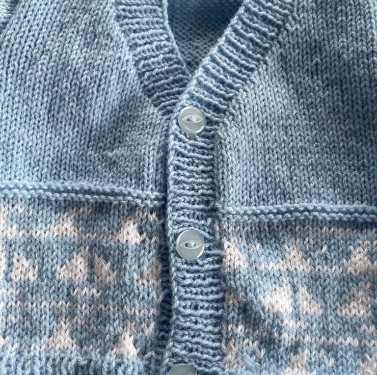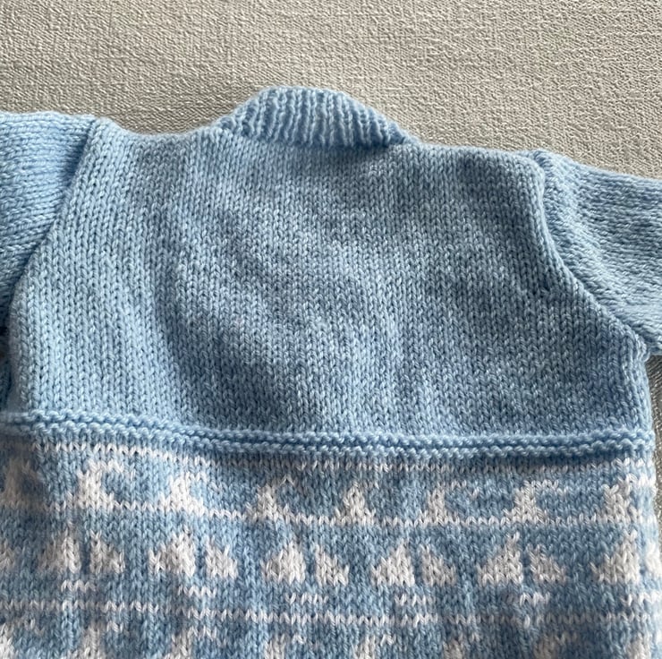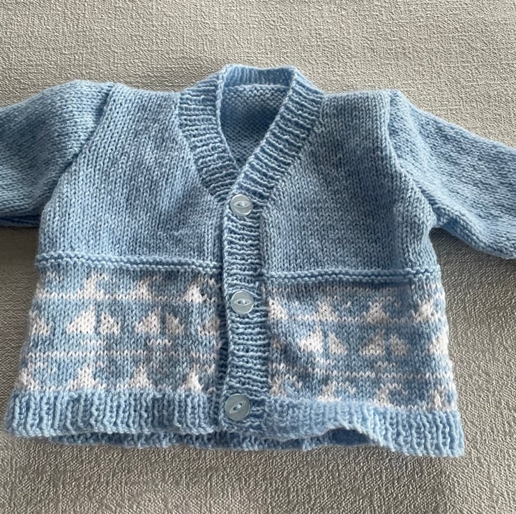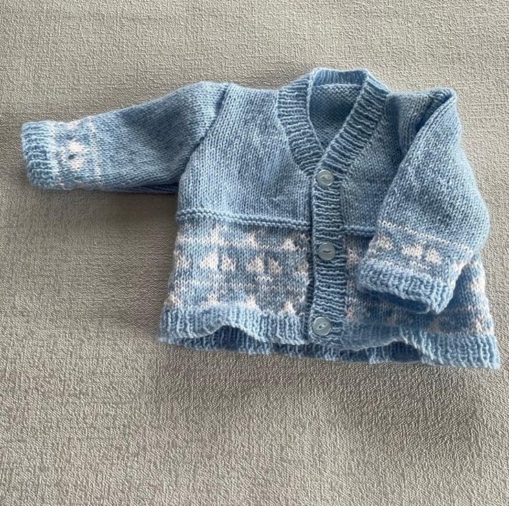 This blue cardigan is hand knitted in a mixed fibre yarn. It is worked with a fair isle border of boats and waves in white round the bottom. The sleeves also have a border of the boats. The cardigan has a v-neck and fastens with three buttons.