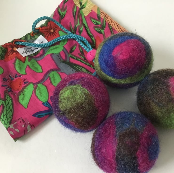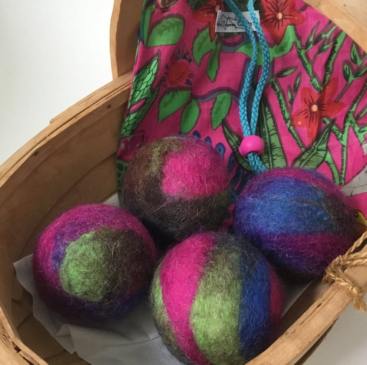 I love making these and I hope you enjoy using them. These tumble dryer balls are 100% pure wool, made from a combination of raw fleece, waste wool and yarn, felted together to make a firm ball. They will not unravel, as the process makes a secure finished product. This set is multi-coloured using a wool name Mercury by the designer. They are supplied in a brightly-coloured drawstring bag. Choose a set of 3 or 4 balls – 3 does a good job. 4 is even better!