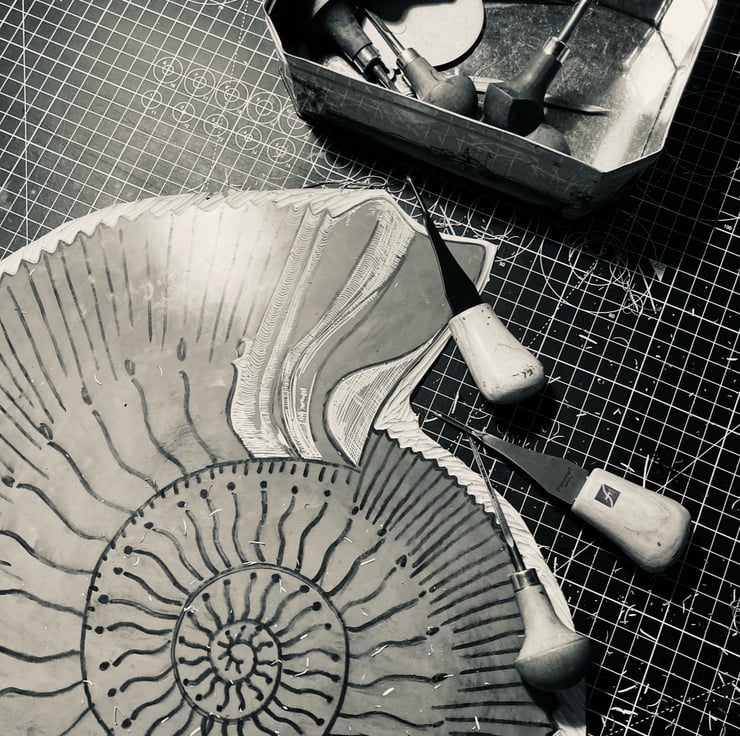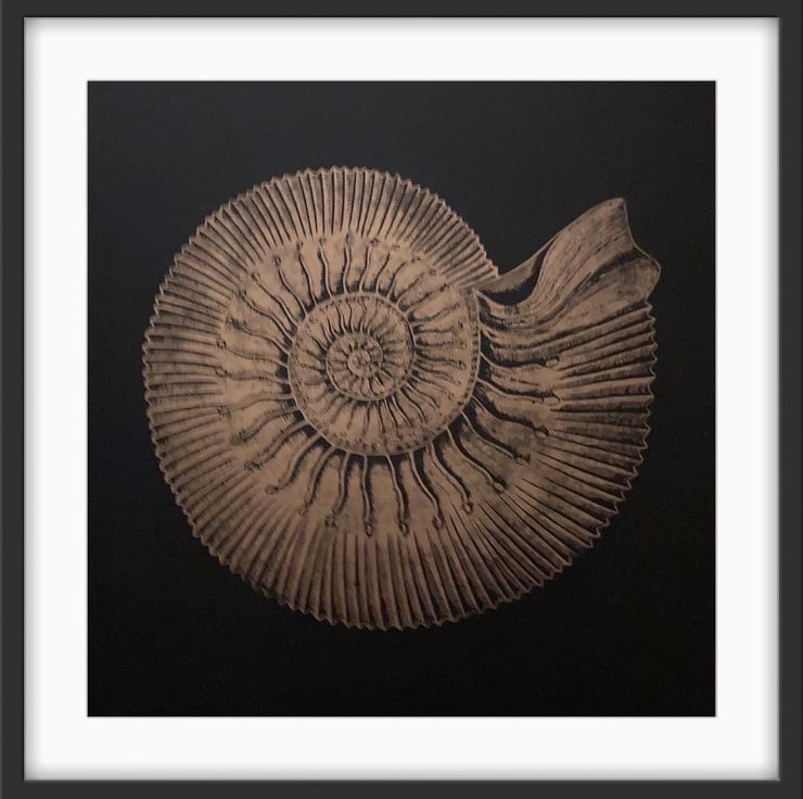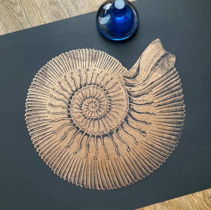 This is a hand illustrated and carved Linocut print of a beautiful ammonite fossil.