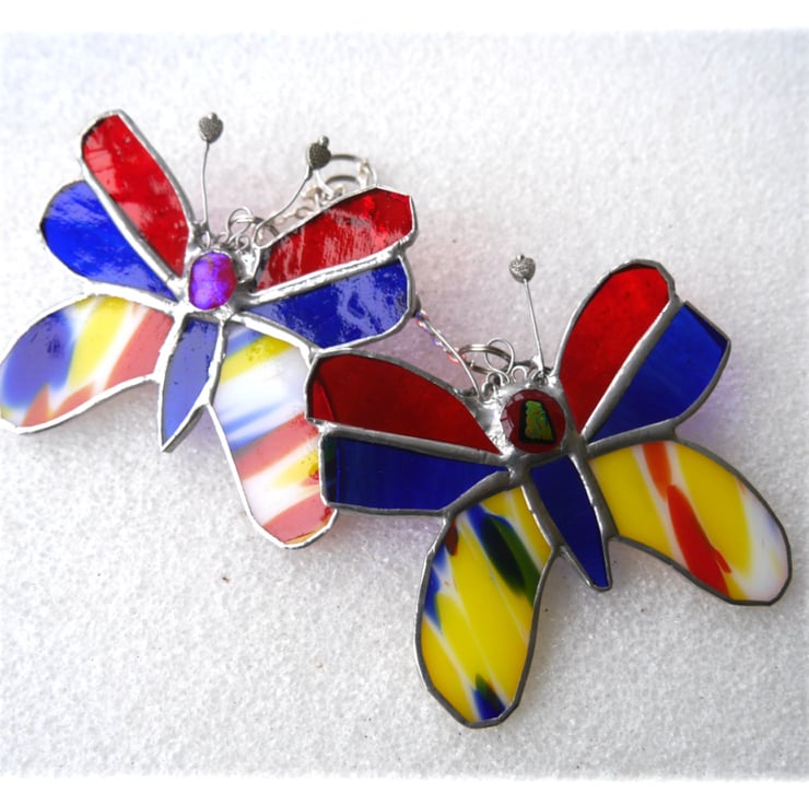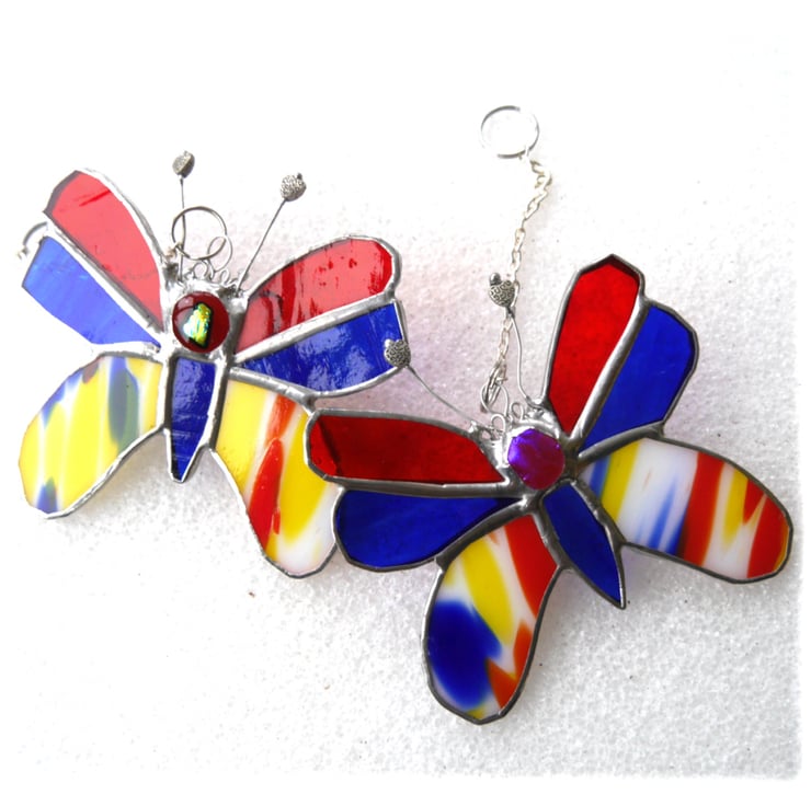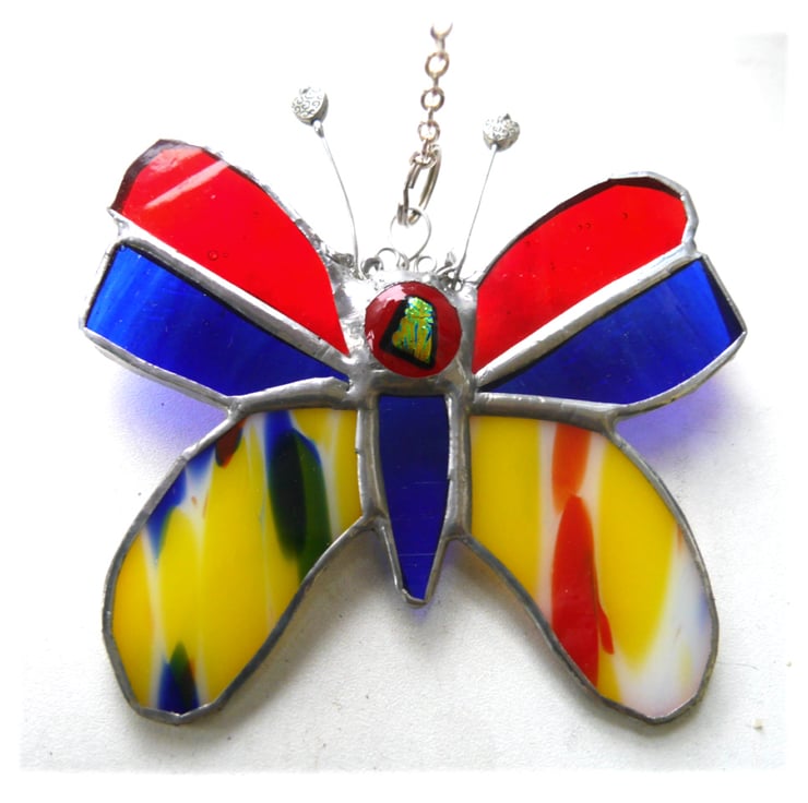 This is a design of butterfly which I made specially to use the rather wonderful bright yellow opaque glass with red and blue splodges. It's actually fusing glass but so lovely I wanted to use it in a stained glass piece instead and I think it's worked really well.
