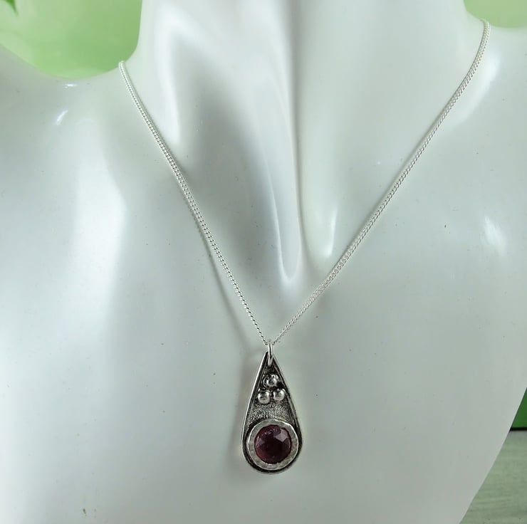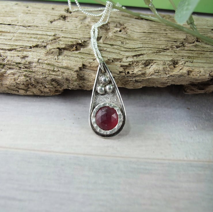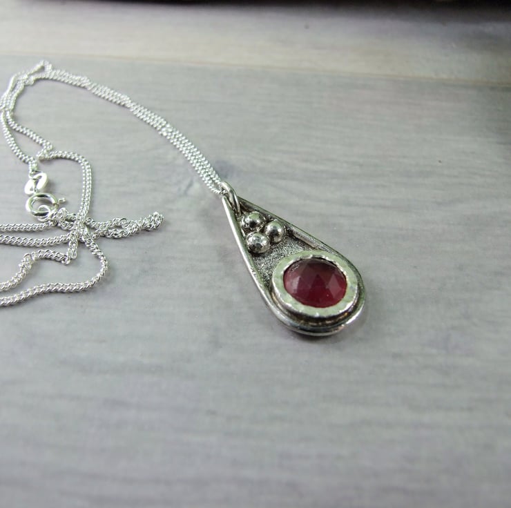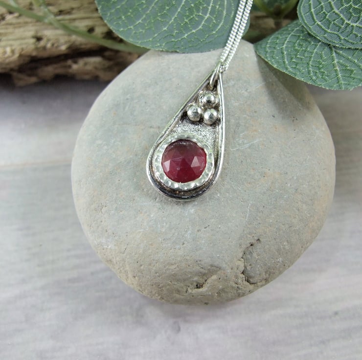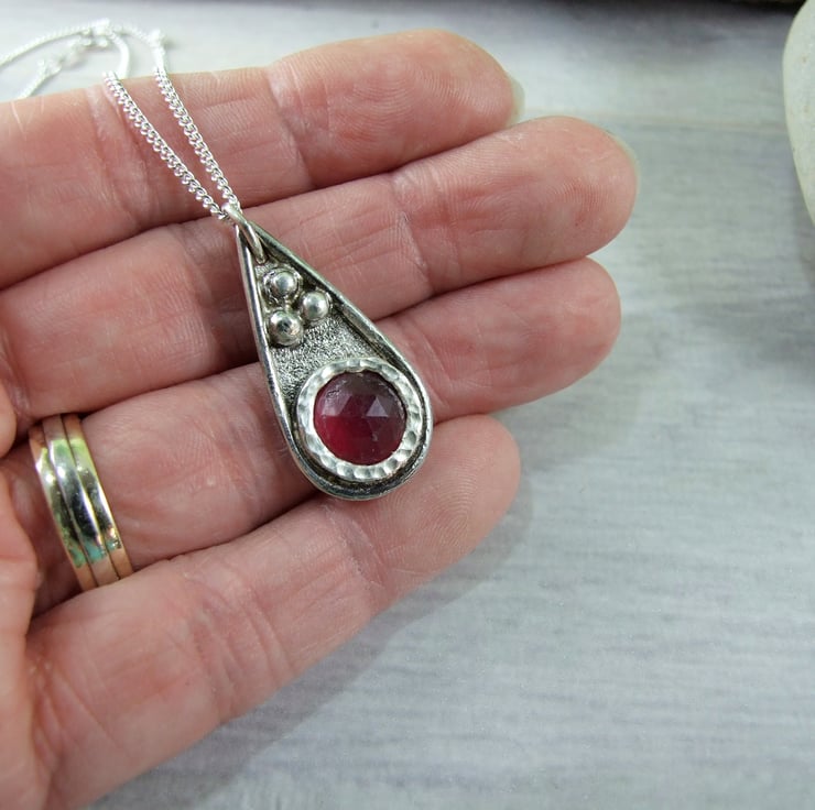 I have created the pendant from recycled silver sheet for the base, hand drawn and cut into a teardrop shape. To this I have added a bezel which fits the stone perfectly and then added some decorative silved beads to the pendant. The red quartz gemstone has been faceted but there are a few places where the stone has imperfections, though it does not affect the look of the overall pendant. Fitted to sterling silver 18 inch chain.
