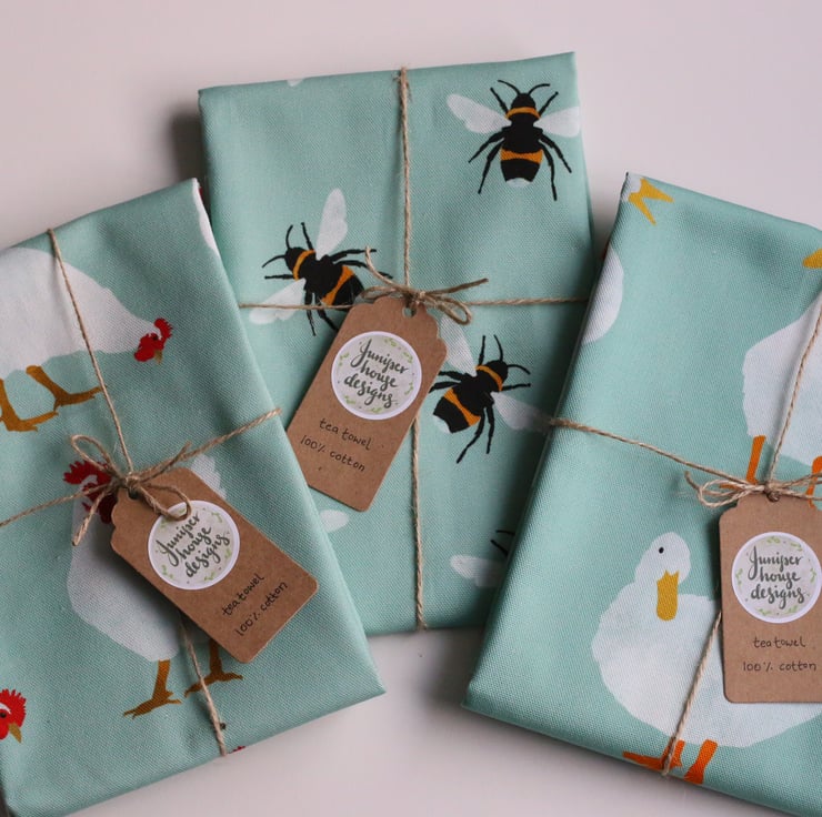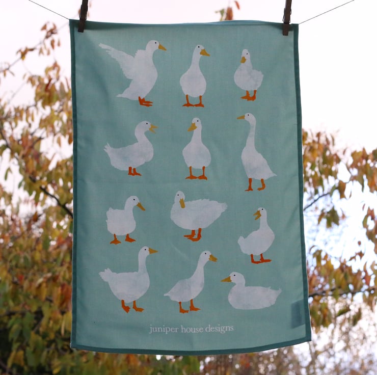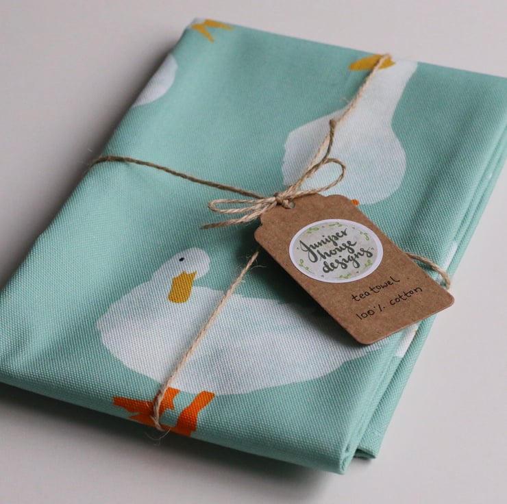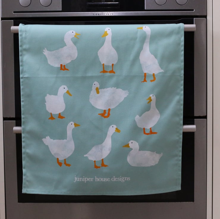 A fun design of beautiful white ducks on a lovely quality cotton tea towel. This is my own design, printed and made in England. I love white ducks, I grew up in a village where you had to stop your car to let the ducks cross the road from the farmyard to their pond! A lovely reminder of English village life. This is a perfect gift for a country kitchen or duck lover.