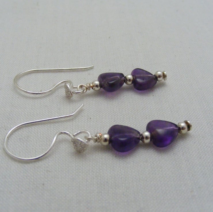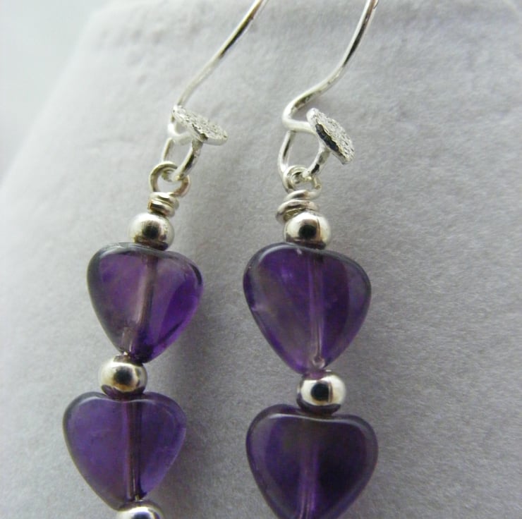 This lovely pair of Amethyst earrings are made with, 8mm Amethyst heart gemstones, 3mm silver plated spacers, Silver plated headpins and ear wires.