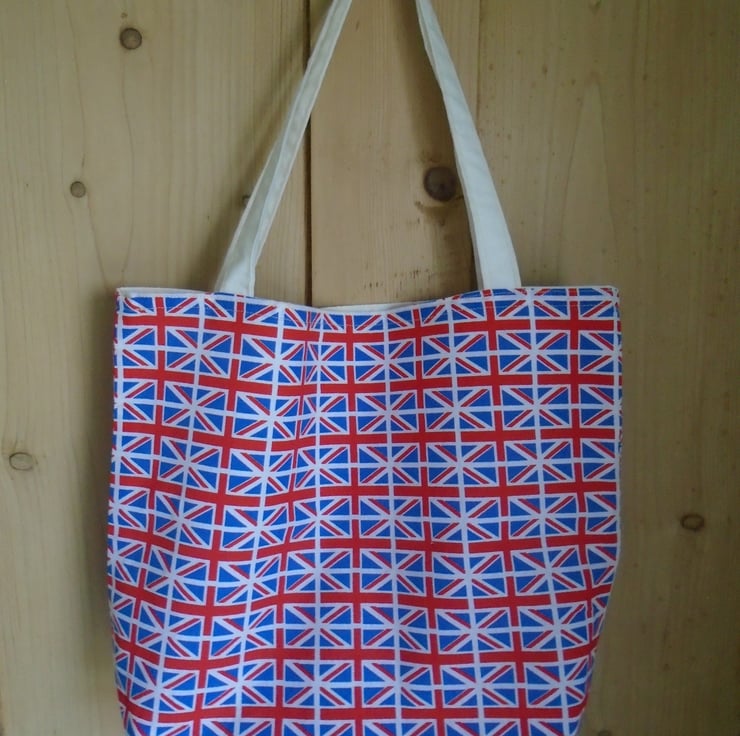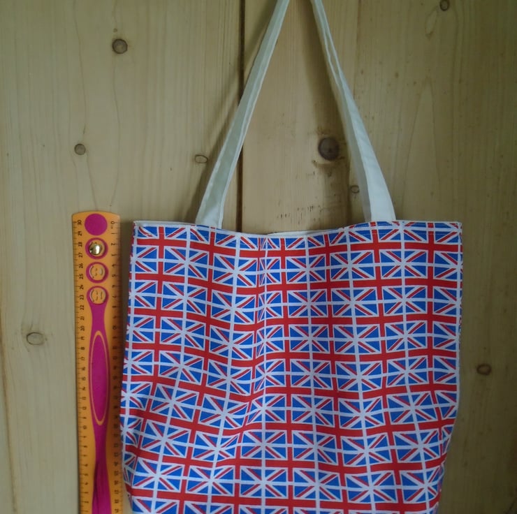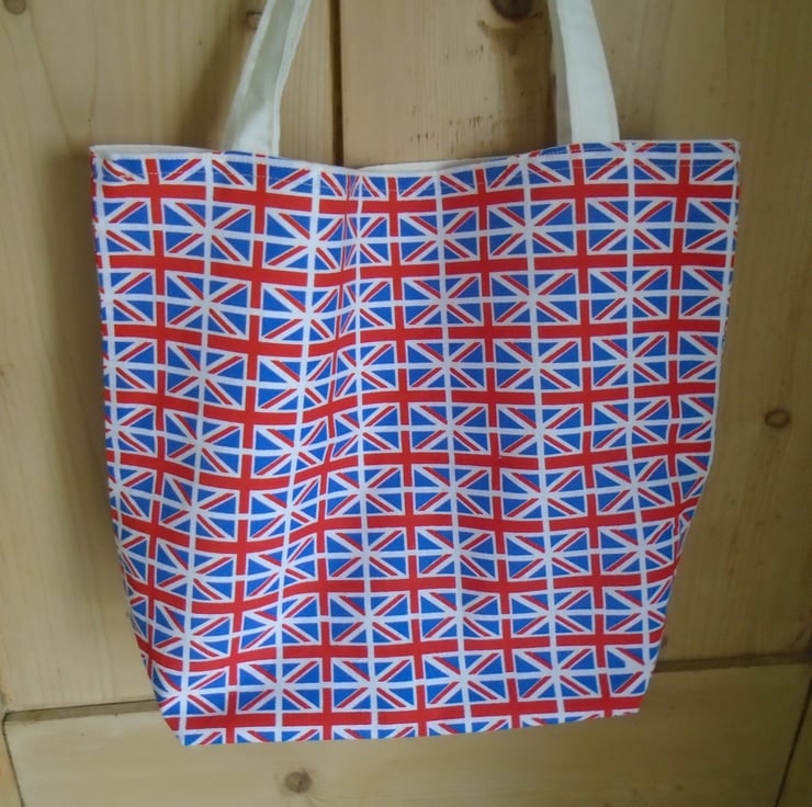Small bag handmade size 27-28 long plus handles 32-33 wide double sided and lined in cream/ivory each one unique. Ideal for the coronation, small shopping trips, hand luggage, gym bag or lunch bag.
