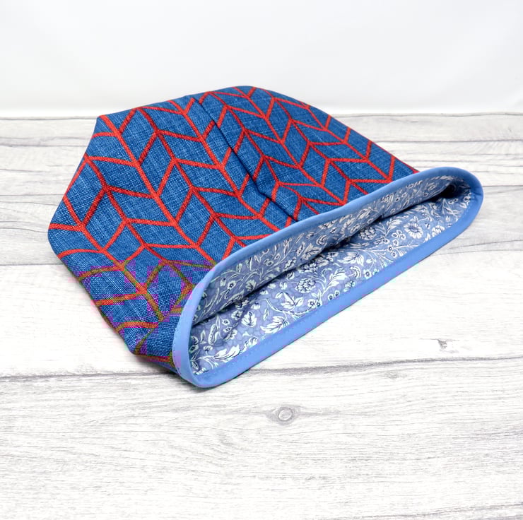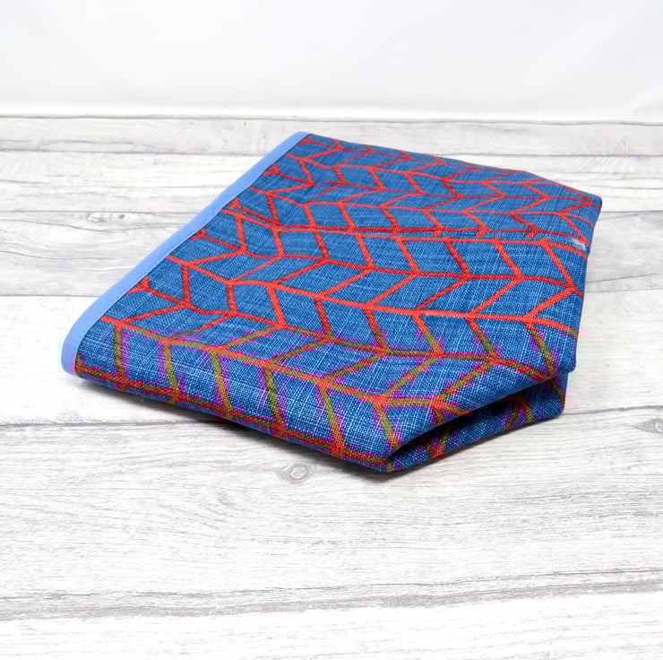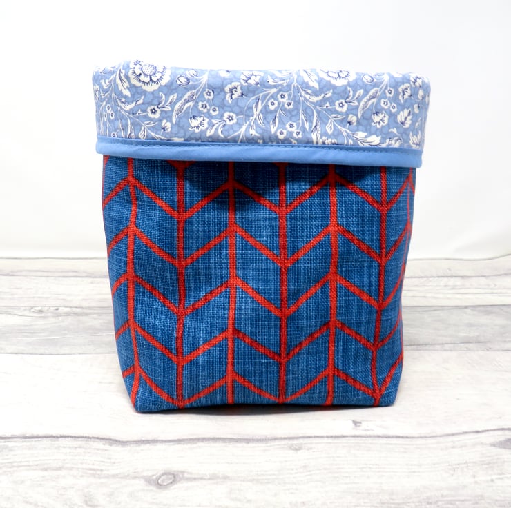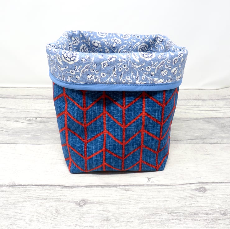 This medium sized storage cube is handmade in a red and blue geometric cotton print. Lined in a blue floral cotton, the top edges have a blue bias binding finish. This fabulous storage tub is reversible giving you two different looks for the price of one!. It has a fleece interlining which gives both structure and softness.
