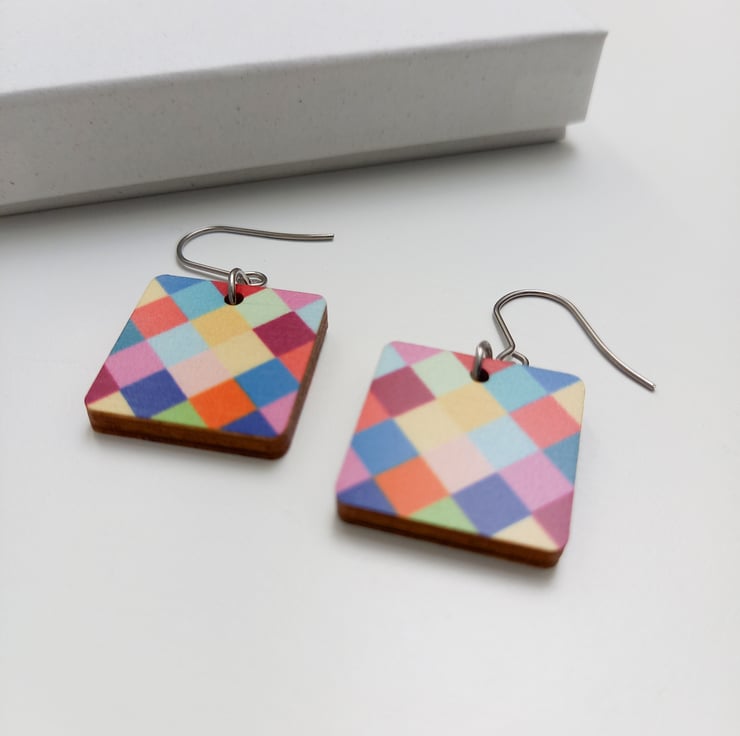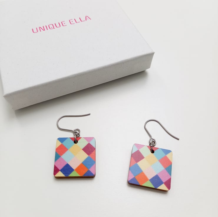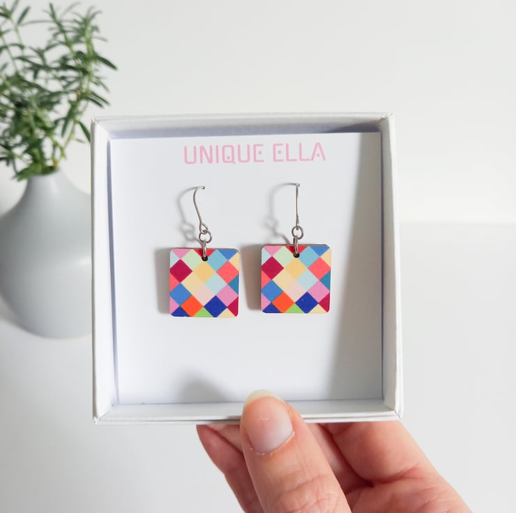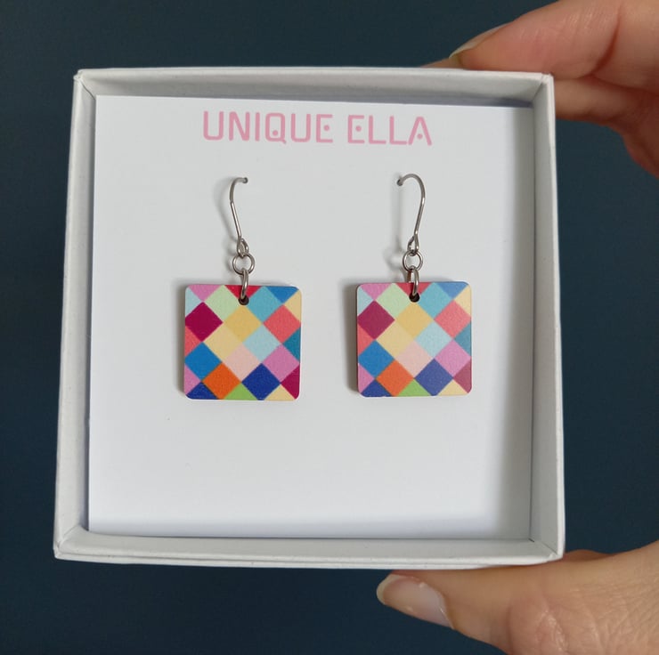 These cheerful colour square drop earrings are inspired by fun colours and geometric lines. The pattern is printed with ecological printing ink and sealed with varnish.