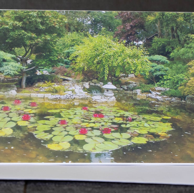 Handmade A6 card featuring an original photograph of water lilies in a pond surrounded by a variety of Acers and ornamental trees. I took the photo whilst visiting Clivedon National Trust House and Gardens in Berkshire