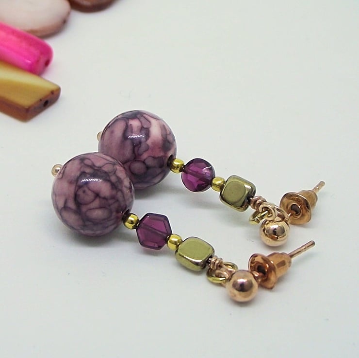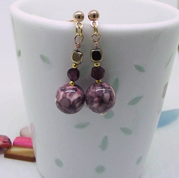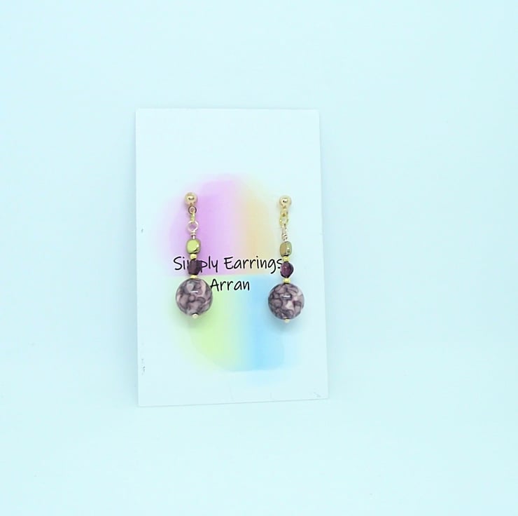 Pale pink and purple jasper, garnet and gold haematite earrings. Rose gold plated stud, wire wrapped bead post and accent beads. Earring drop 34mm.