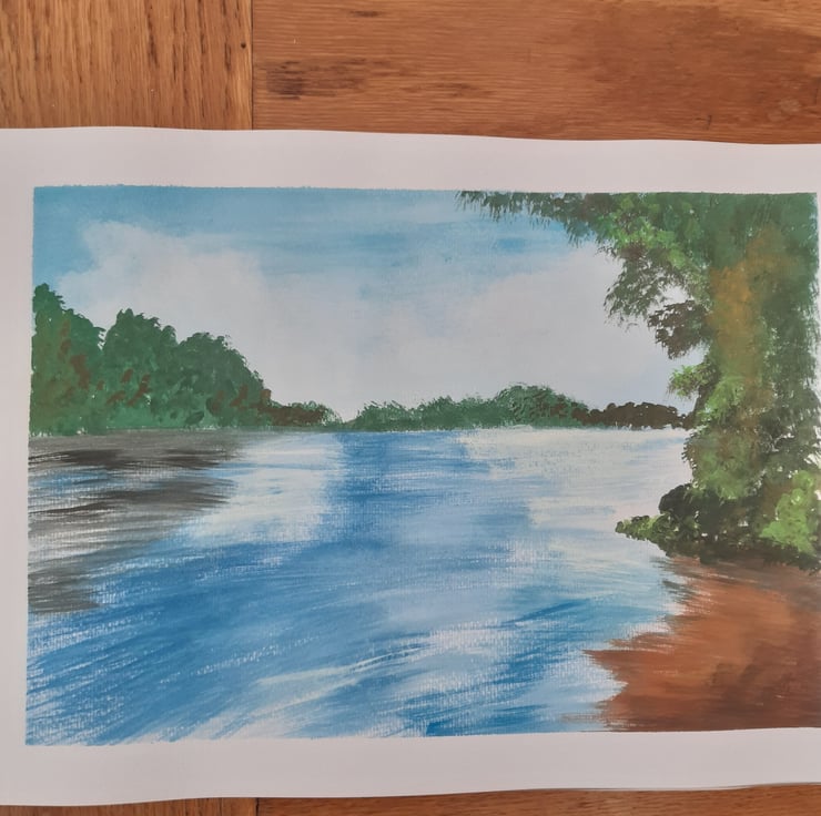 Watercolour painting on 230 GSM, water, colour paper, 15 time 10.5 inches approximately. Depicting river trees, bright blue sky reflecting the clouds.