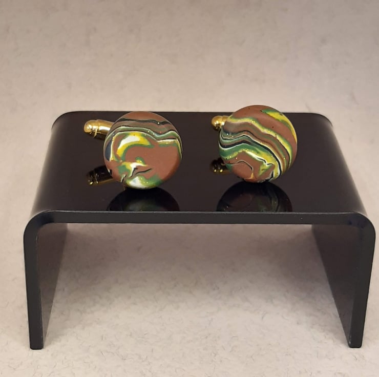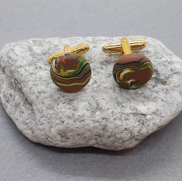 Handmade cufflinks using a mixture of brown, yellow, green and black polymer clay to create this unique swirl design with a hint of sparkle.