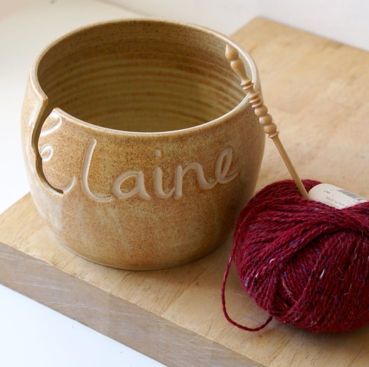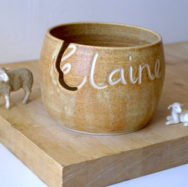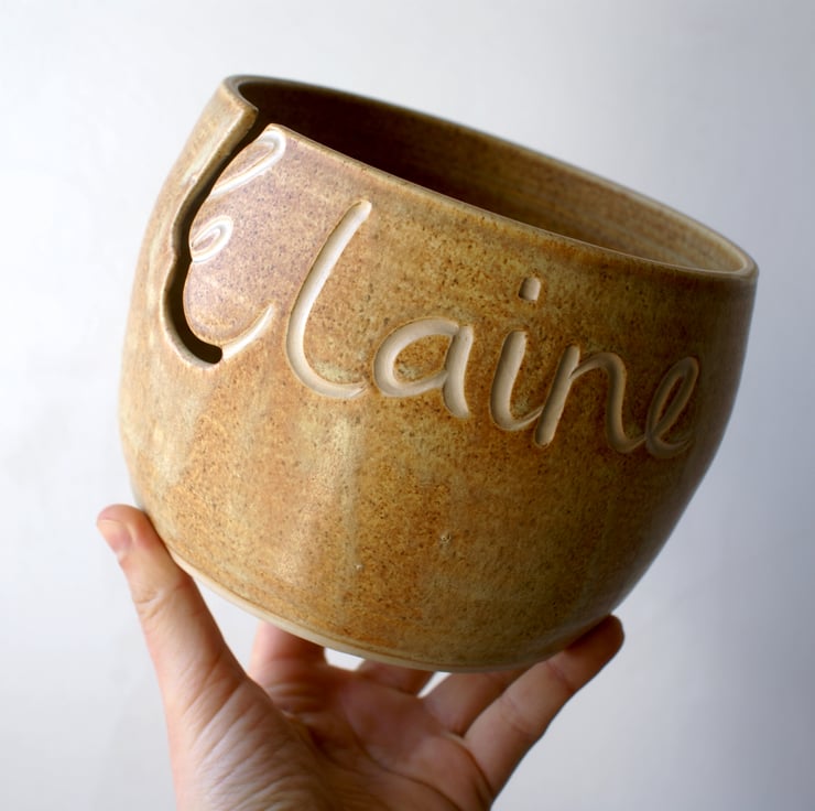 This named yarn bowl features the name 'Elaine' carved into the front making an ideal personalised gift. The inside of the E has been cut out to be the hook for the yarn to loop into when knitting. It's been glazed simply in a transparent glaze but you can still see the name underneath as it catches the light.