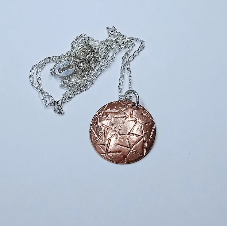 I have made this beautiful copper pendant by cutting the shape from copper sheet and applying a random star stamped design before doming to create shape and polishing.
