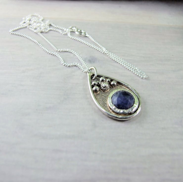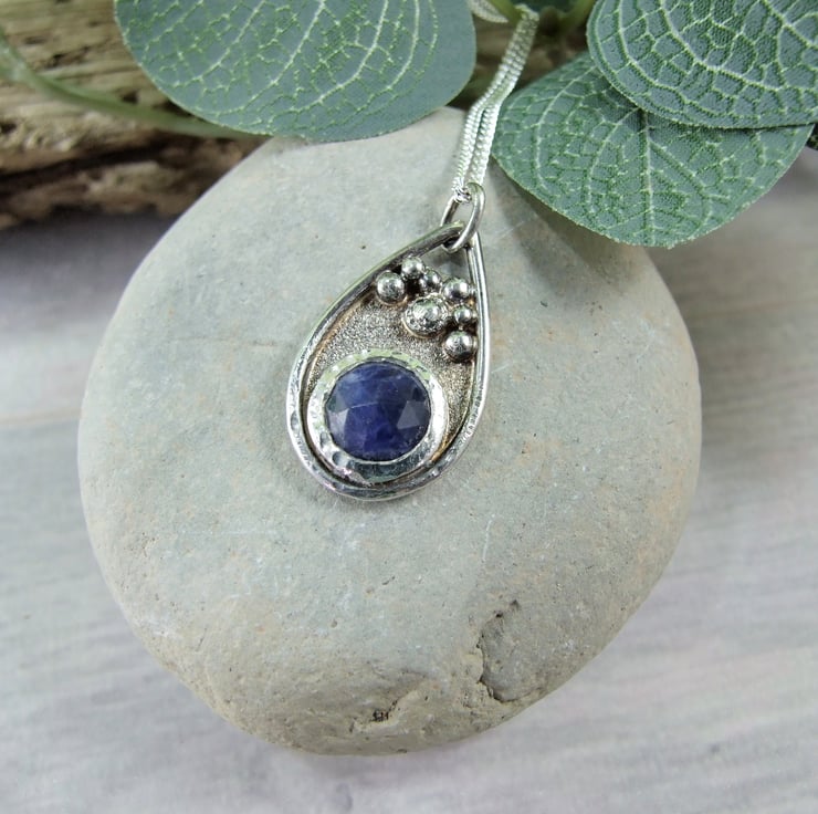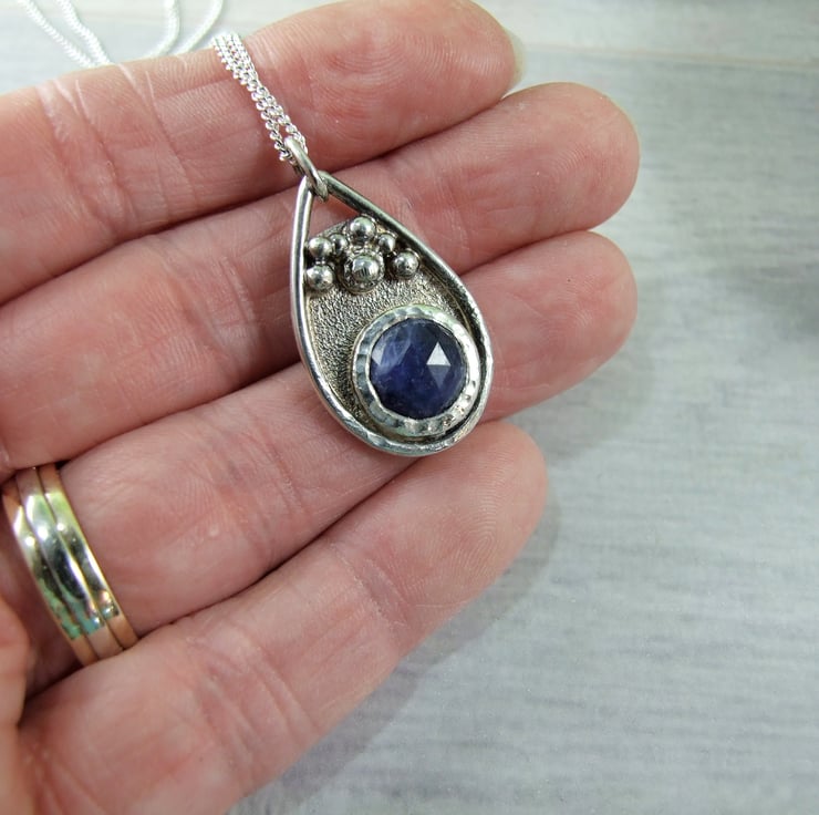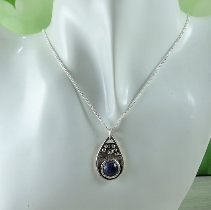 I have created the pendant from recycled silver sheet for the base, hand drawn and cut into a teardrop shape. To this I have added a bezel which fits the stone perfectly and then added some decorative silved beads to the pendant. The sodalite gemstone has been faceted but there are a few places where the stone has imperfections, though it does not affect the look of the overall pendant. Fitted to sterling silver 18 inch chain.