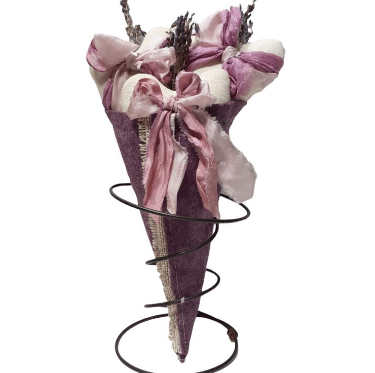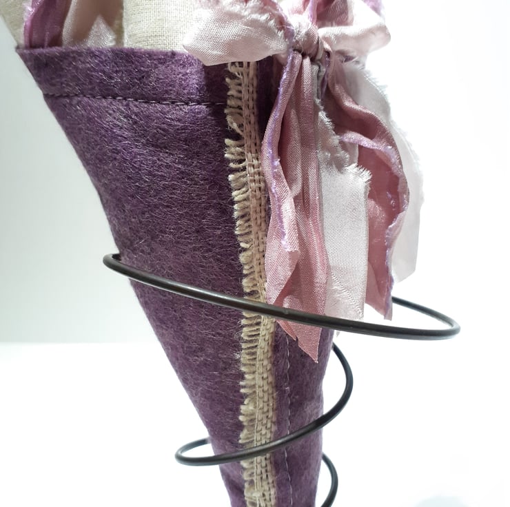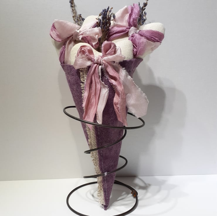 Using this most gorgeous soft mauve felt which is 'lined' with hessian makes a perfect vase ornament especially with the addition of 3 calico hearts with silk ribbons tied around them and with the finishing touch of dried lavender. A beautiful gift for someone very special in your life or a fabulous treat for yourself. Sitting inside one of my vintage bed springs making it really easy for placing it in the perfect spot to show it off.