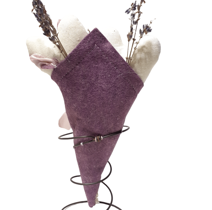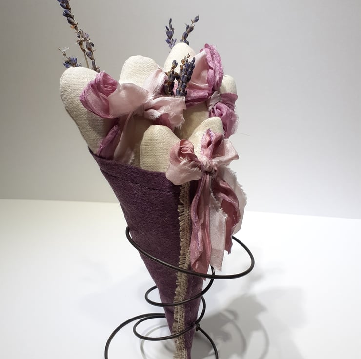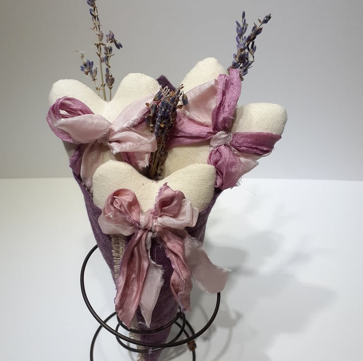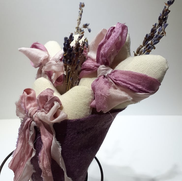 I wanted to create something really different gift to show how much someone is loved. The mauve wool felt is the perfect colour to show off calico hearts with their silk ribbon and just a touch of dried lavender which gives a hint of lavender smell.