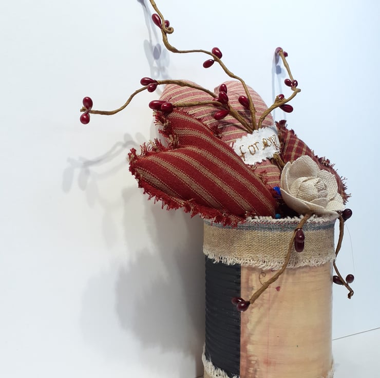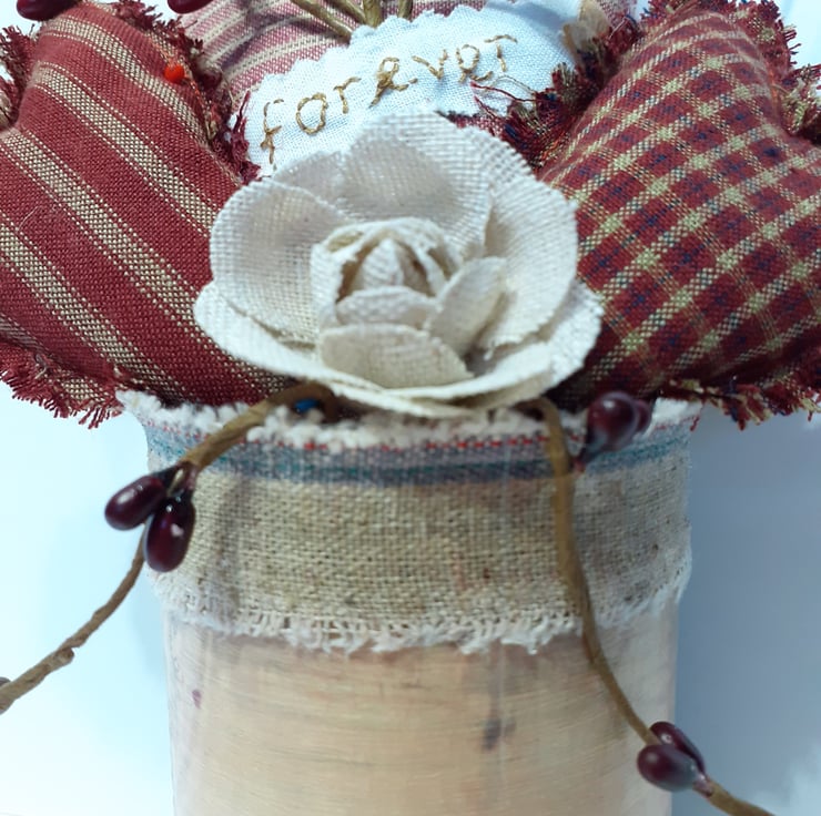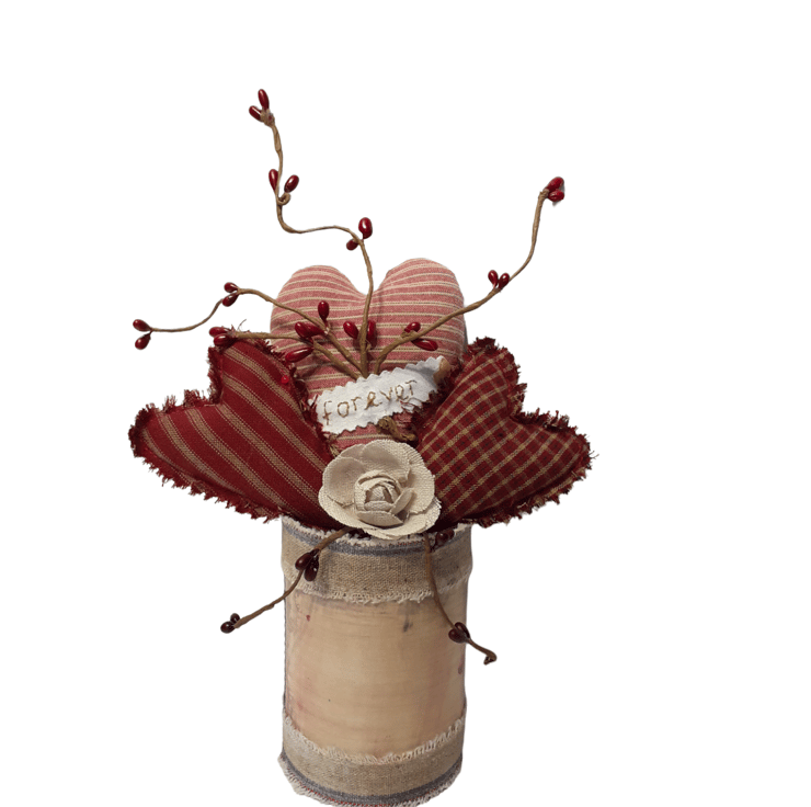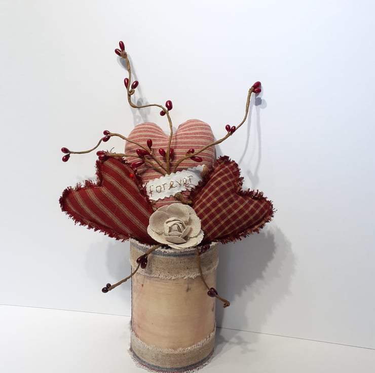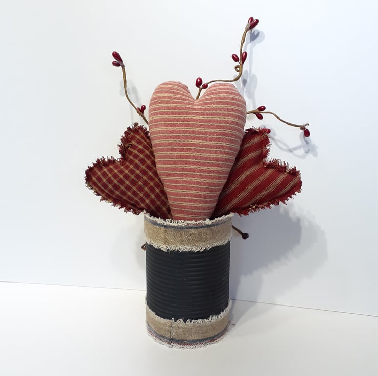 Three different sized and styled hearts made using beautiful Homespun cotton fabric, one with 'forever' hand embroidered on it; an added little hessian rose along with pip berries all gathered together and sitting inside a recycled tin which has been edged with aged hessian ribbon and has a 'tea stained' label on the front, which all ready for you to personalise before you give this unique gift to the very special person in your life. A beautiful one-off gift which can be given at any time of the year whether it be Valentines, birthday, anniversary or for that impromptu moment.