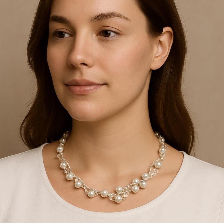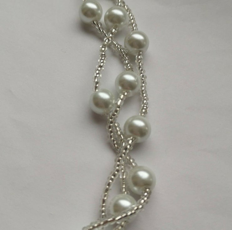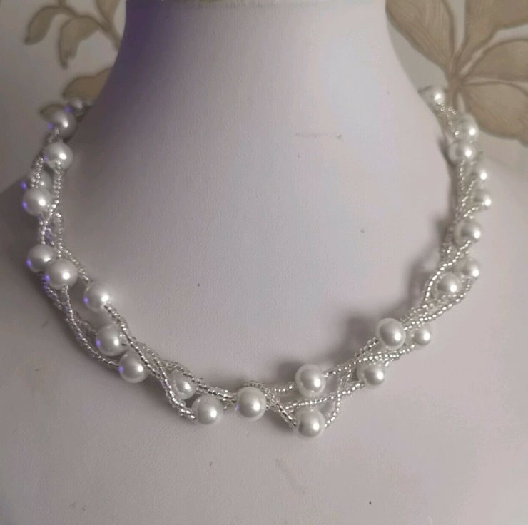 Twisted Glass pearl & Seed bead necklace white silver beaded triple strand women