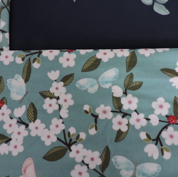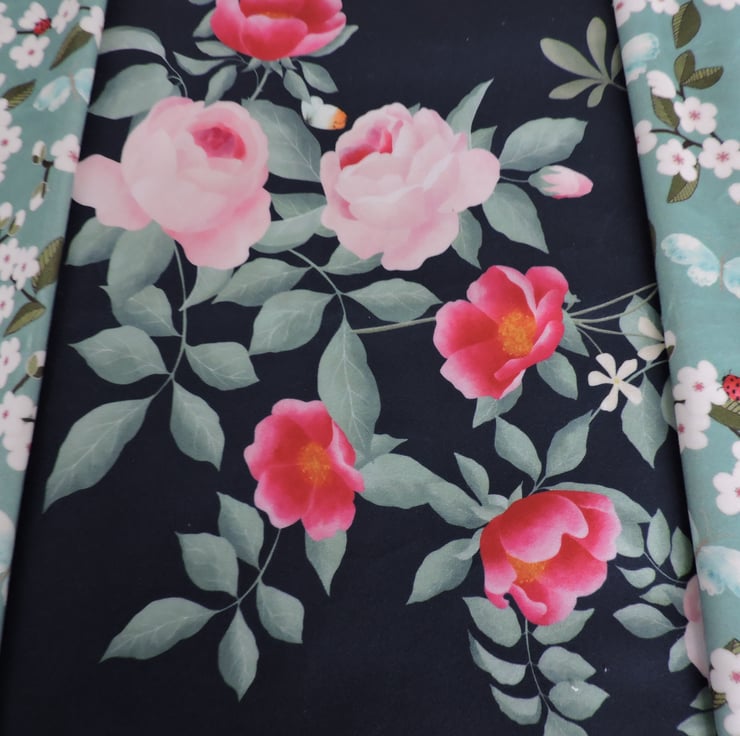 1 piece of pink roses with green leaves on a navy blue background, measuring 20in (51cm) by 18in (46cm)