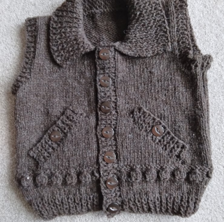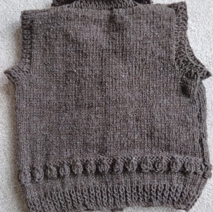 Hand knitted brown chunky body warmer, gilet or waistcoat. Made from Patons wool blend Aran. Warm and cosy. Machine washable., 2-3 years, There is nothing wrong with this, it is just surplus stock.