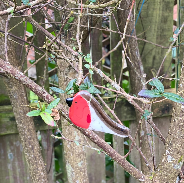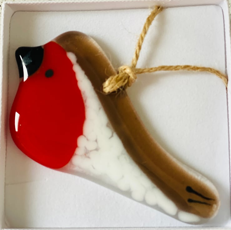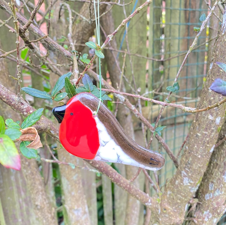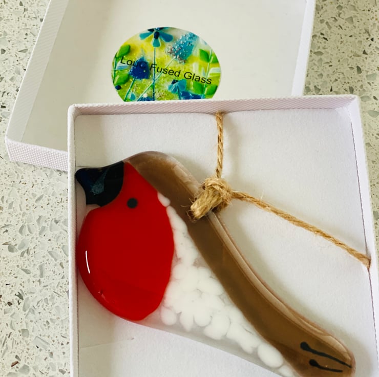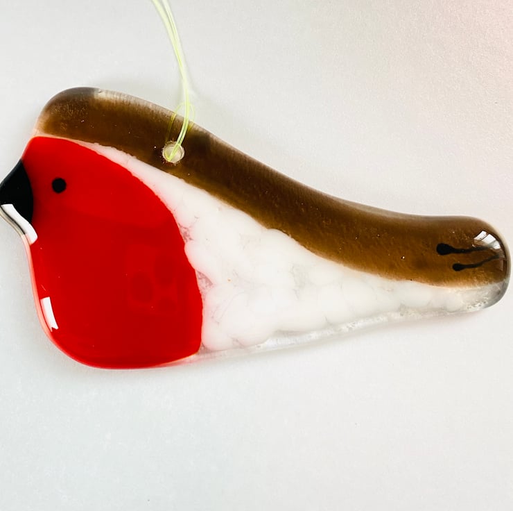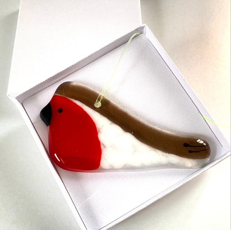 A cute and robust little robin that can be hung inside or outside the home . The robin is aproximately 6 inch diameter and 1/4 inch thick . The fused glass is double thickness and drilled and strung with r strong nylon thread so that the robin appears to hang mid air . They catch the light beautifully and would make a lovely gift . Comes in a white gift box .