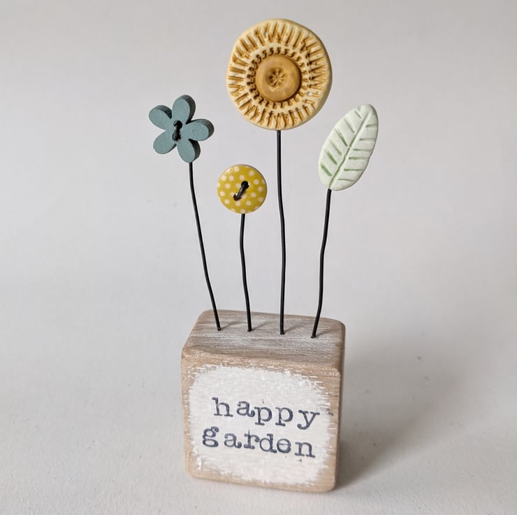 The hand stamped words on the front say 'happy garden'.