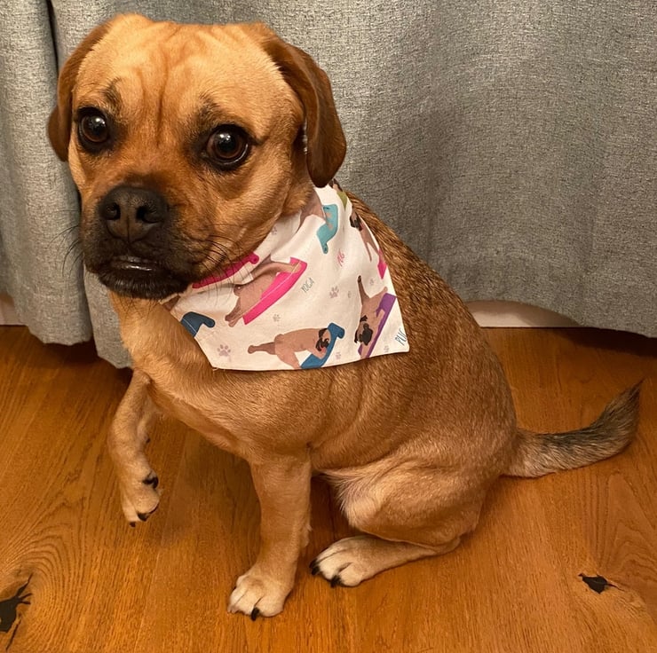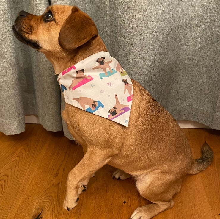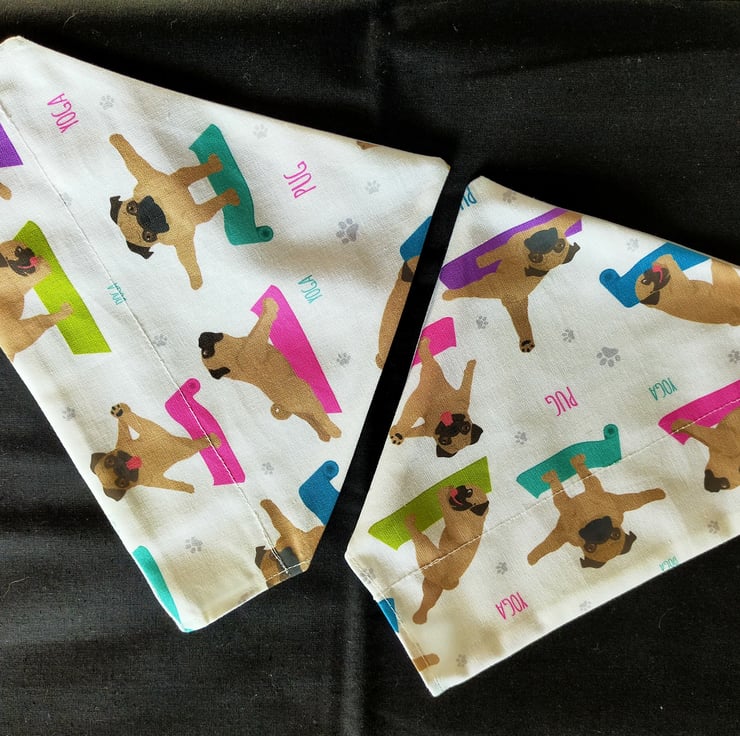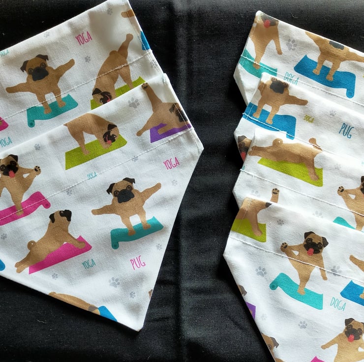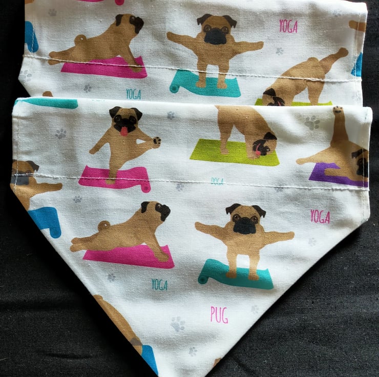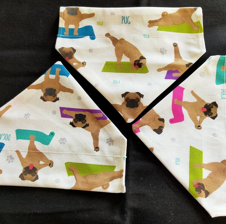 This fun, over-the-collar bandana is made from poly cotton fabric with an all over design of Pugs doing yoga. Due to the design of the fabric, placement of pugs will vary from bandana to bandana.